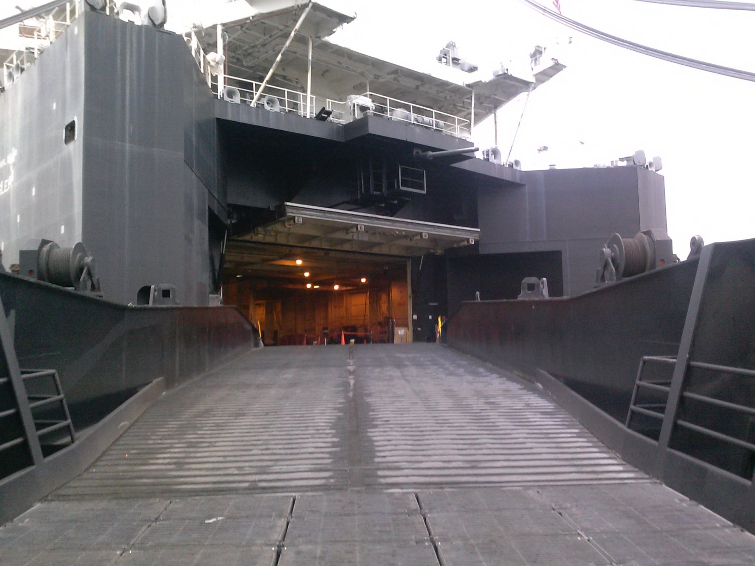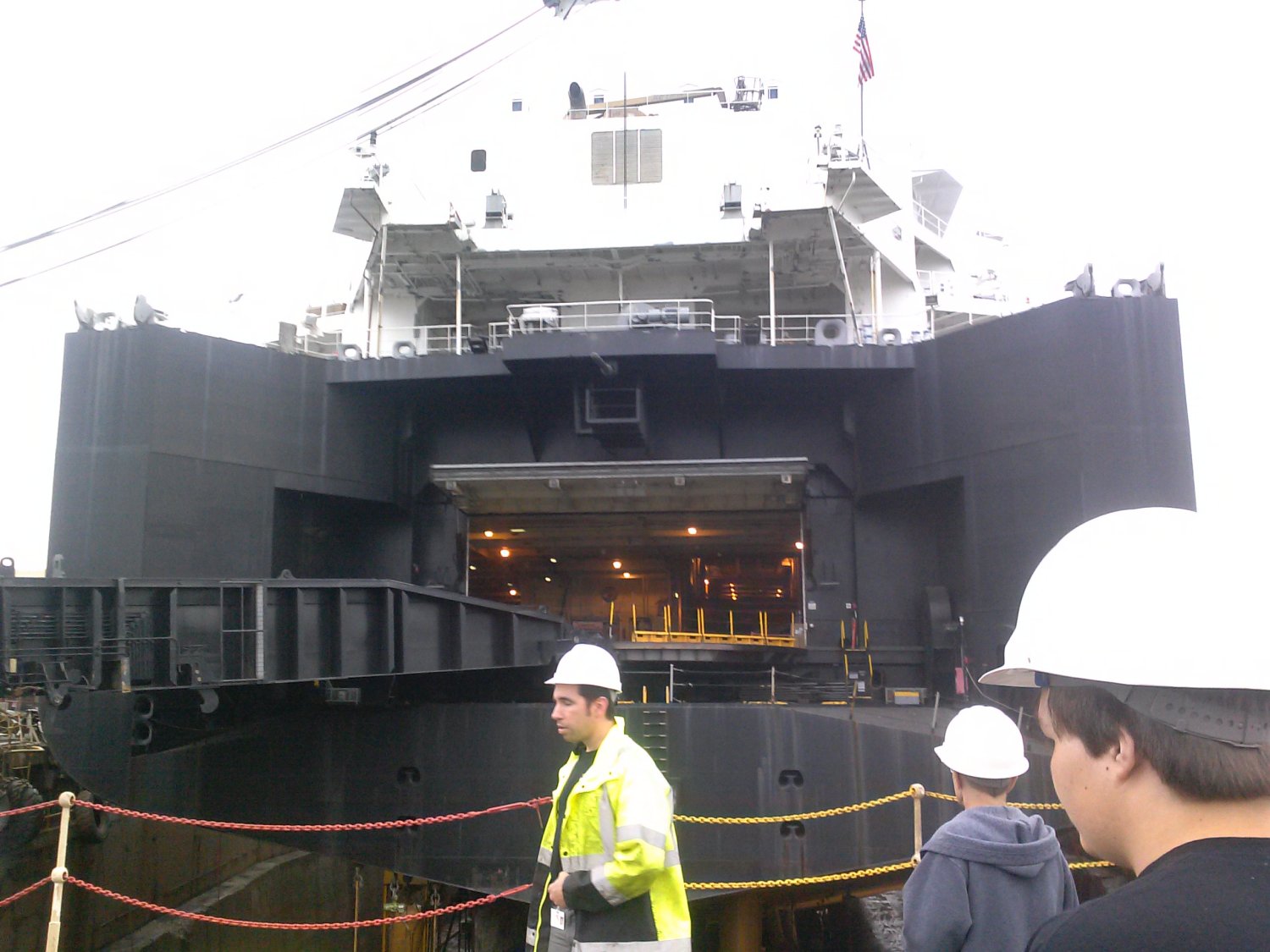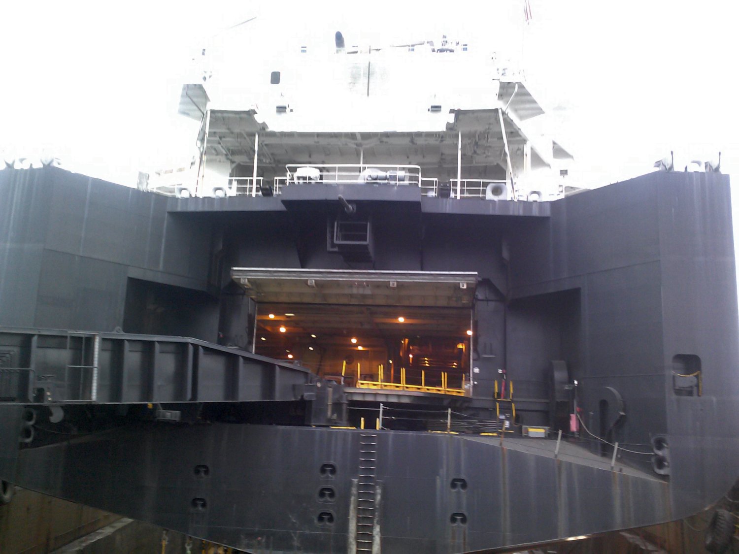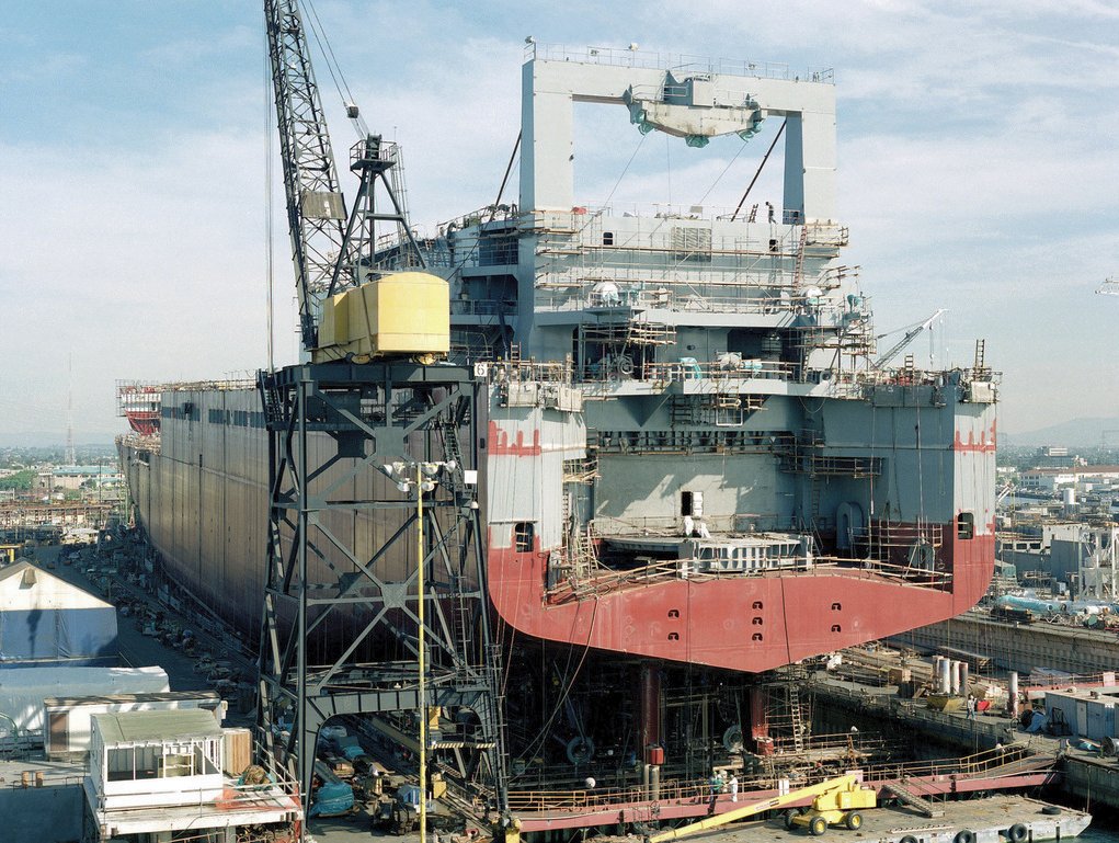228k | Port quarter view of the MSC (Military Sealift Command) strategic heavy lift ship USNS Sisler (T-AKR-311) under construction on the building ways
