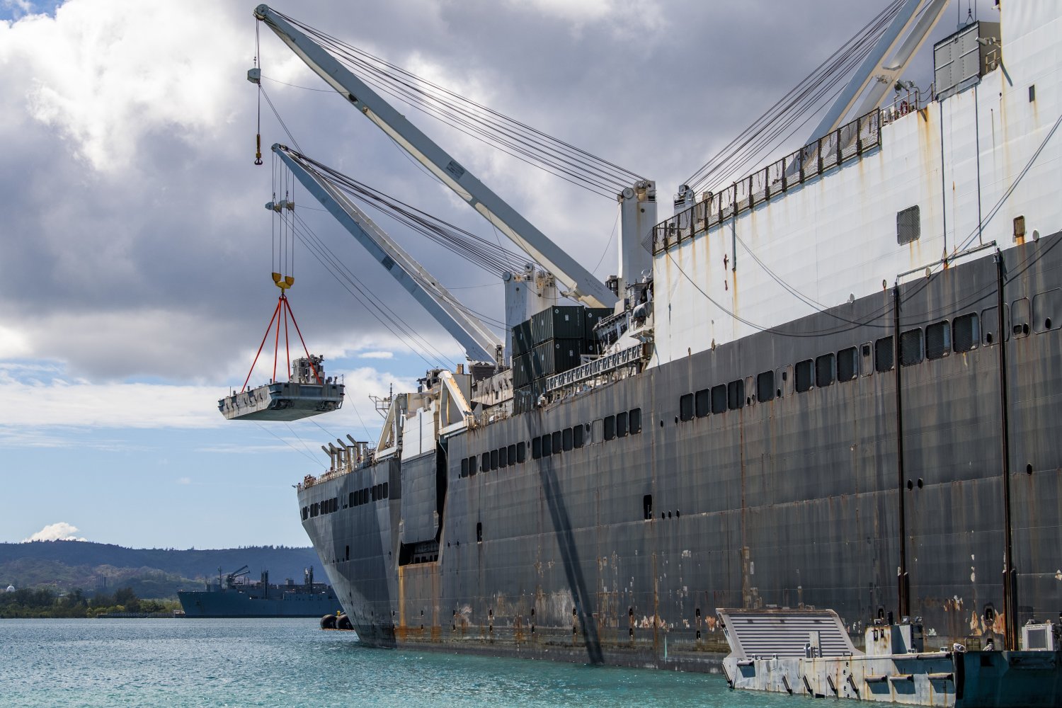 keep tension on lines as an Improved Navy Lighterage System (INLS) power module is lifted by a crane during an operation to offload equipment for construction of an