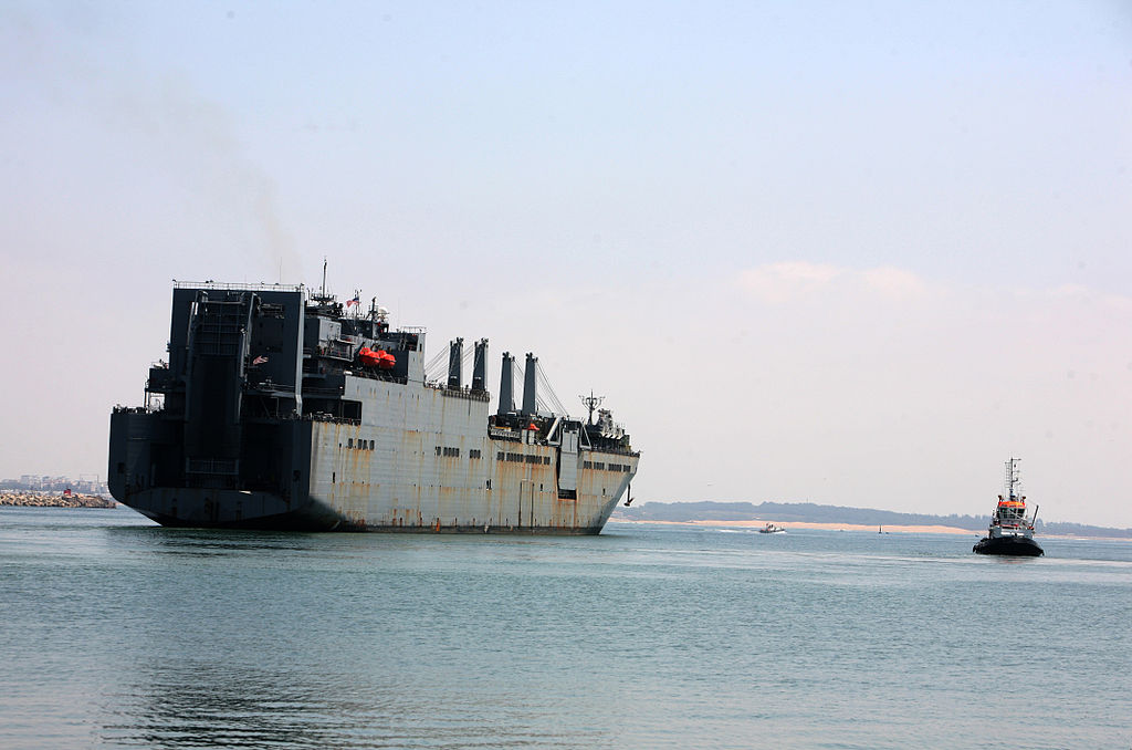 97k | USNS Dahl (T-AKR 312) leaves the port of Agadir, Morocco, 9 April 2013, to anchor offshore, after delivering vehicles and equipment in support