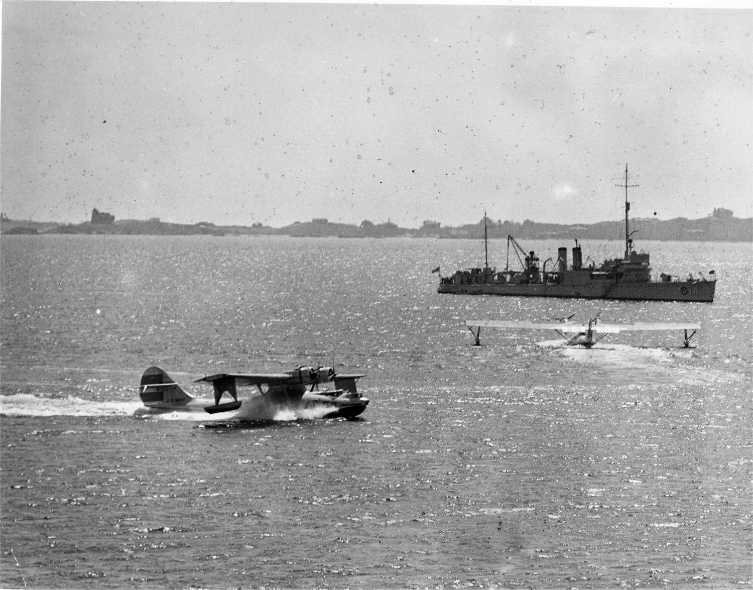 348k | USS Childs (AVP-14) at anchor, 15 April 1939 in Narragansett Bay. Photo Caption reads; "WAR BIRDS GATHER TWO NAVY PATROL BOMBERS, PART OF THE FORCES WHICH WILL "DEFEND" THE INDUSTRIAL EAST AGAINST A THEORETICAL ATTACK IN WAR GAMES TO START NEXT WEEK, LAND ON THE WATERS OF NARRAGANSETT BAY OFF THE RHODE ISLAND COAST APRIL 15. THE DESTROYER CHILDS (BACKGROUND) WILL ACT AS AN AIRCRAFT GUARD DURING MANEUVERS." ASSOCIATED PRESS PHOTO 4-15-39 9:15PES LKM JO. |
