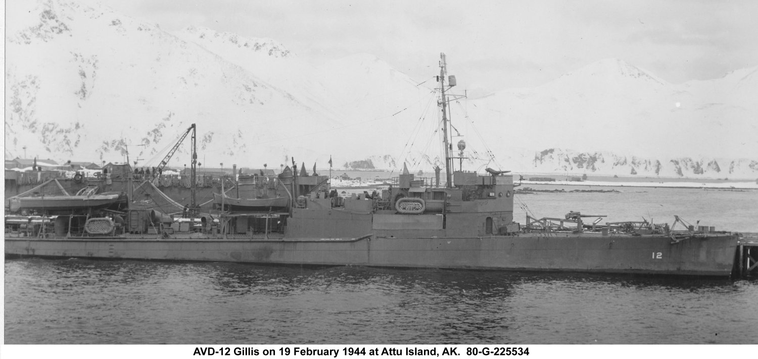 146k | USS Gillis (AVD-12) moored pierside at Attu Island, AK., 19 February 1944.