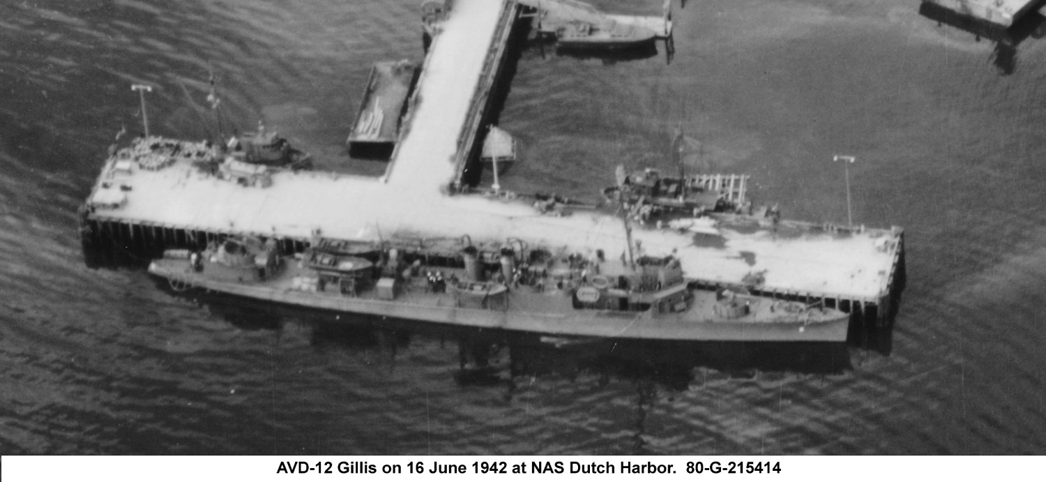 140k | USS Gillis (AVD-12) moored pierside at NAS Dutch Harbor AK., 16 June 1942.