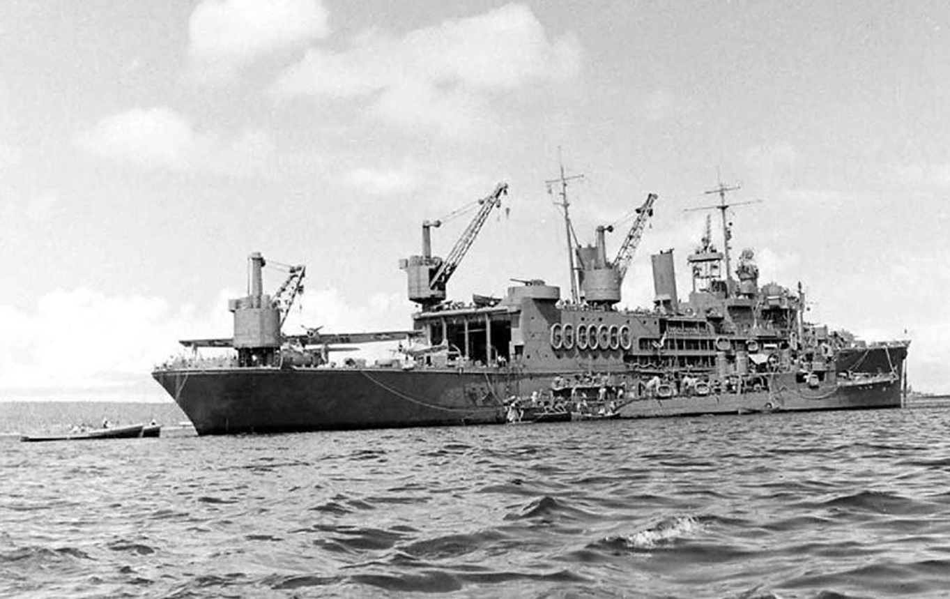 345k | USS McFarland (AVD-14) alongside USS Curtiss (AV-4) for a forward overhaul at Espiritu Santo, 3 to 15 Oct 1942.