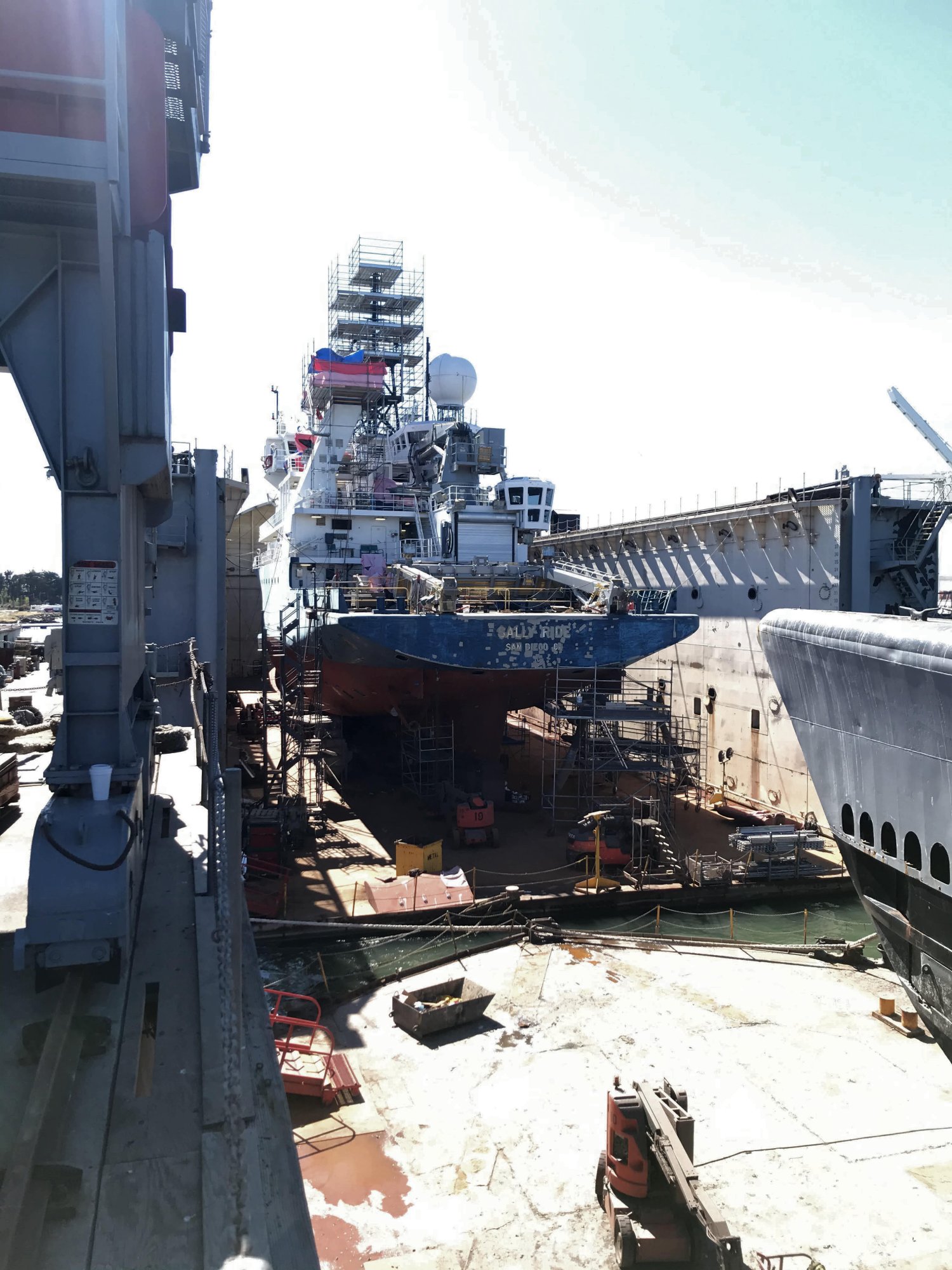 224k | R/V Sally Ride (AGOR-28) drydocked at Bay Ship and Yacht Co., Alameda CA., 27 April 2021. She is sitting in ex-Hughes Mining Barge HMB-1, the covered drydock in which the navy's experimental "Stealth" ship Sea Shadow(IX-529) was built and housed in the 1980s and 1990s. Also in the drydock with R/V Sally Ride is ex-USS Pampanito (SS-383) | Photo by Christopher Edwards, San Francisco Maritime National Park, NPS Service | |