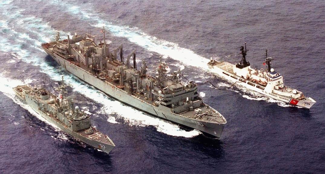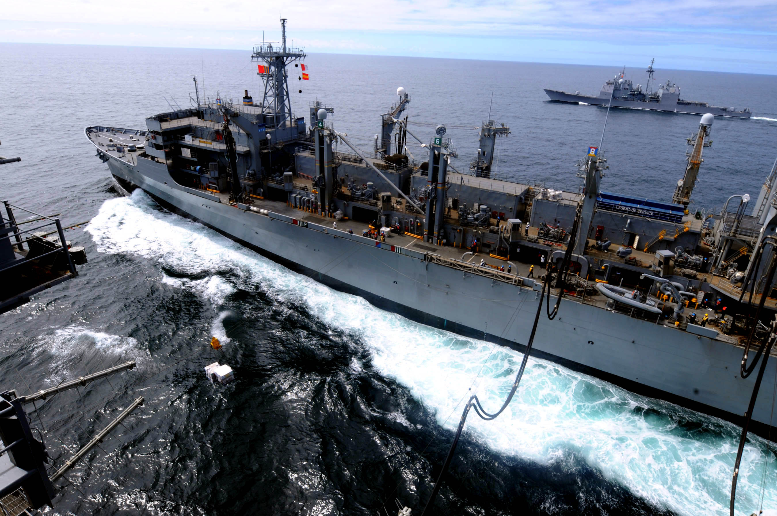 cruiser USS Mobile Bay (CG-53) and USNS Rainier (T-AOE-7) conduct a replenishment-at-sea. Providing a combat-ready force to protect