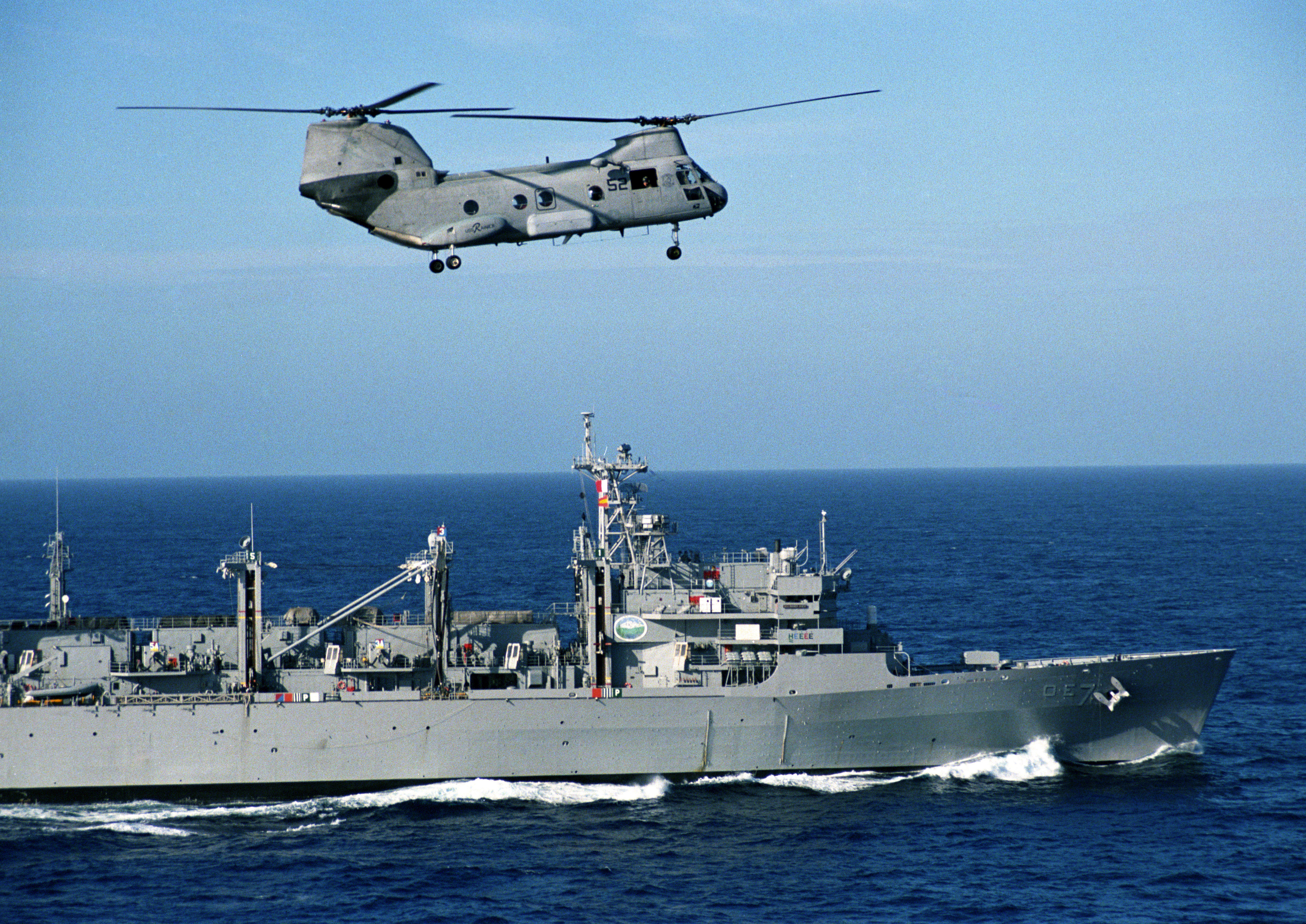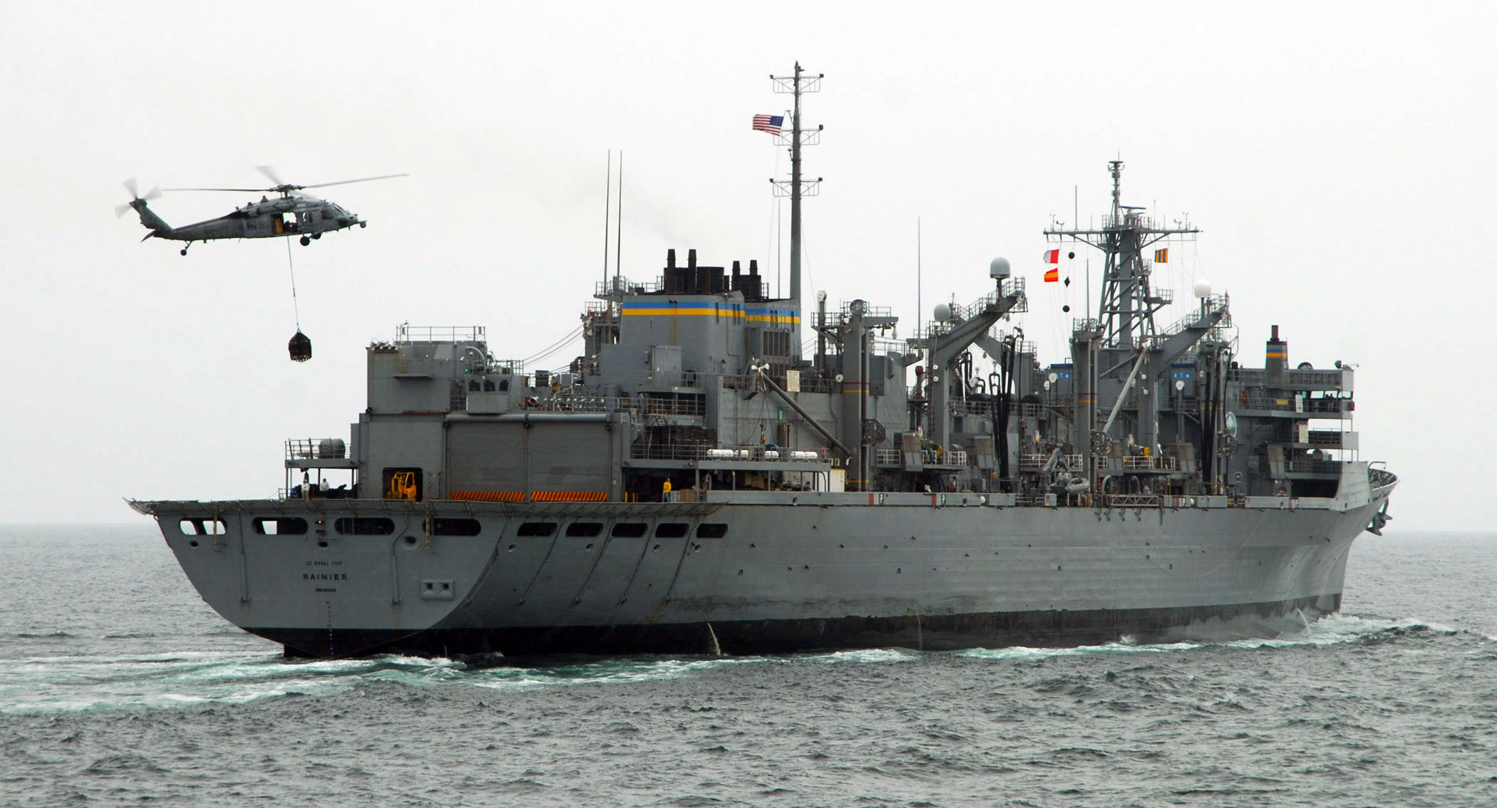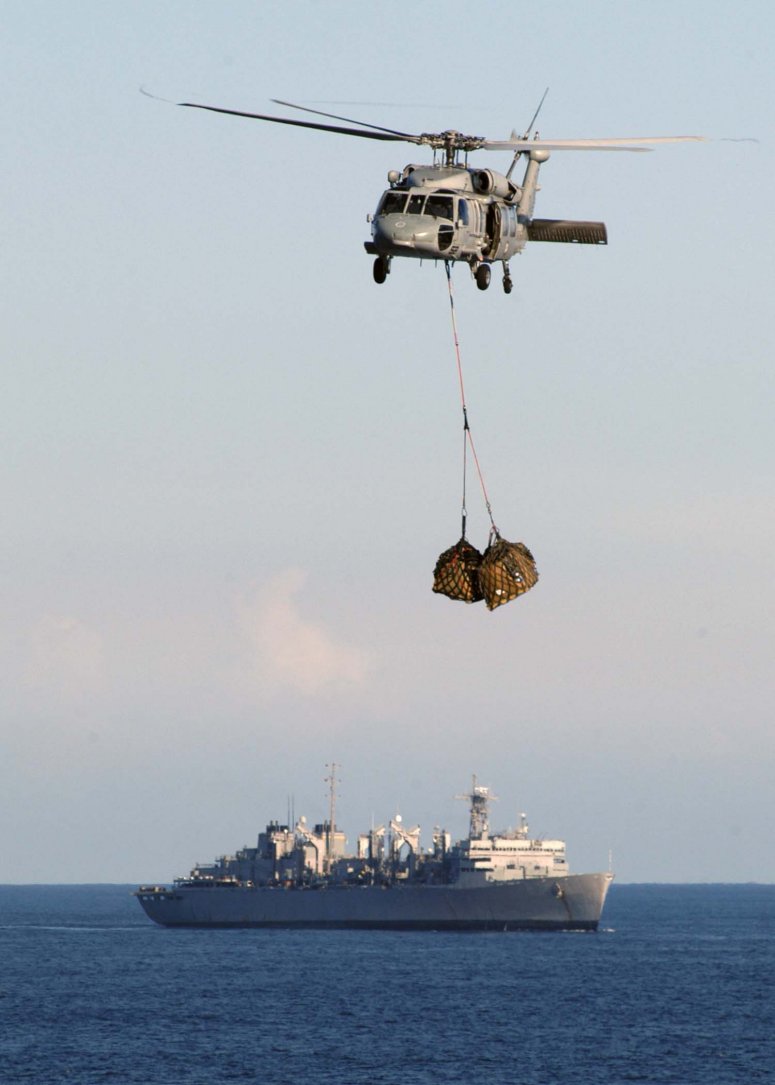 76k | USNS Rainier (T-AOE-7) in the Andaman Sea, 14 January 2005 - An MH-60S Knighthawk helicopter, assigned to the "Gunbearers"
