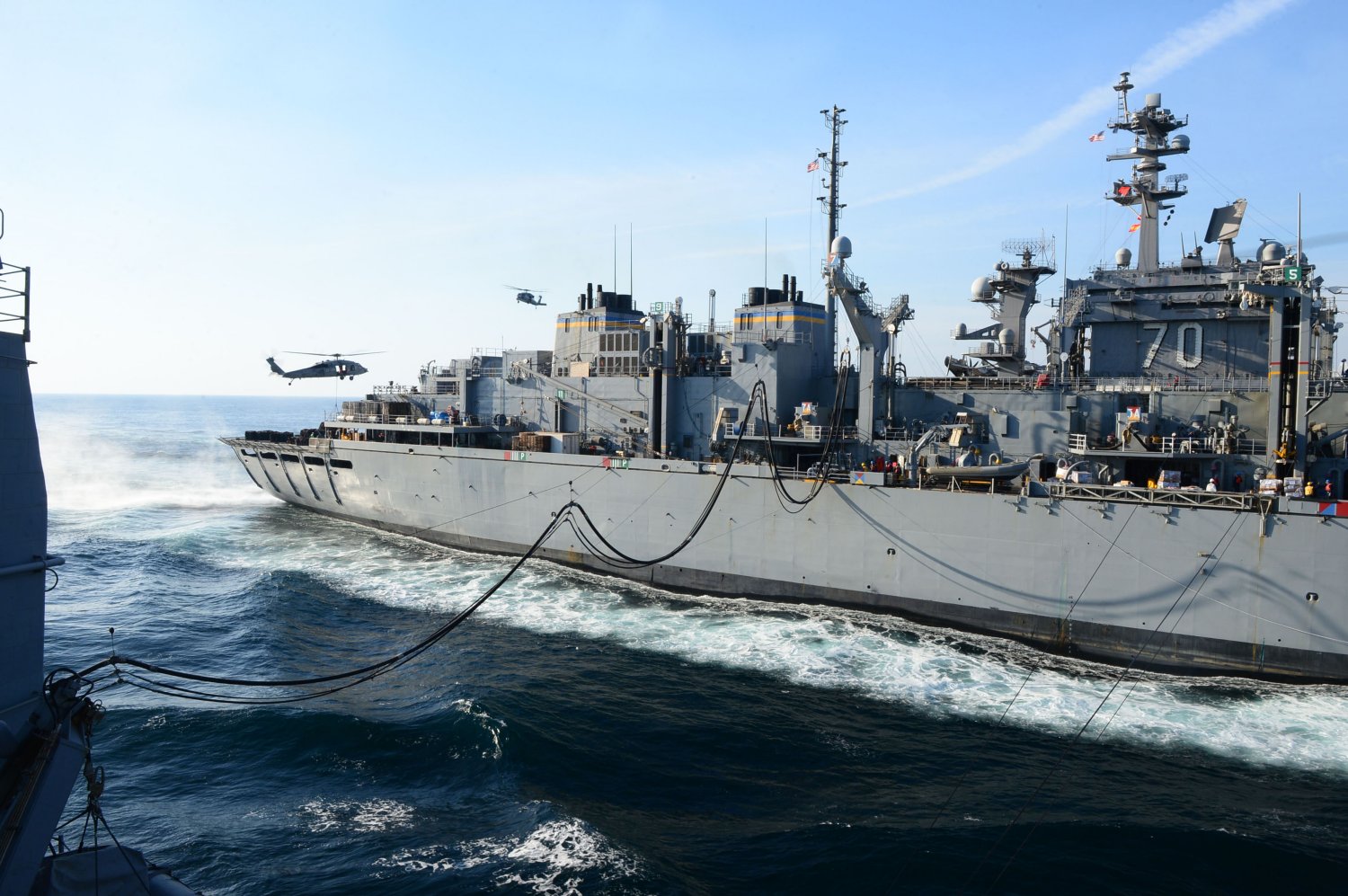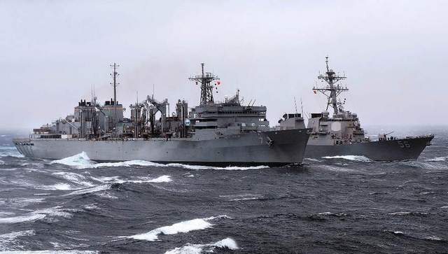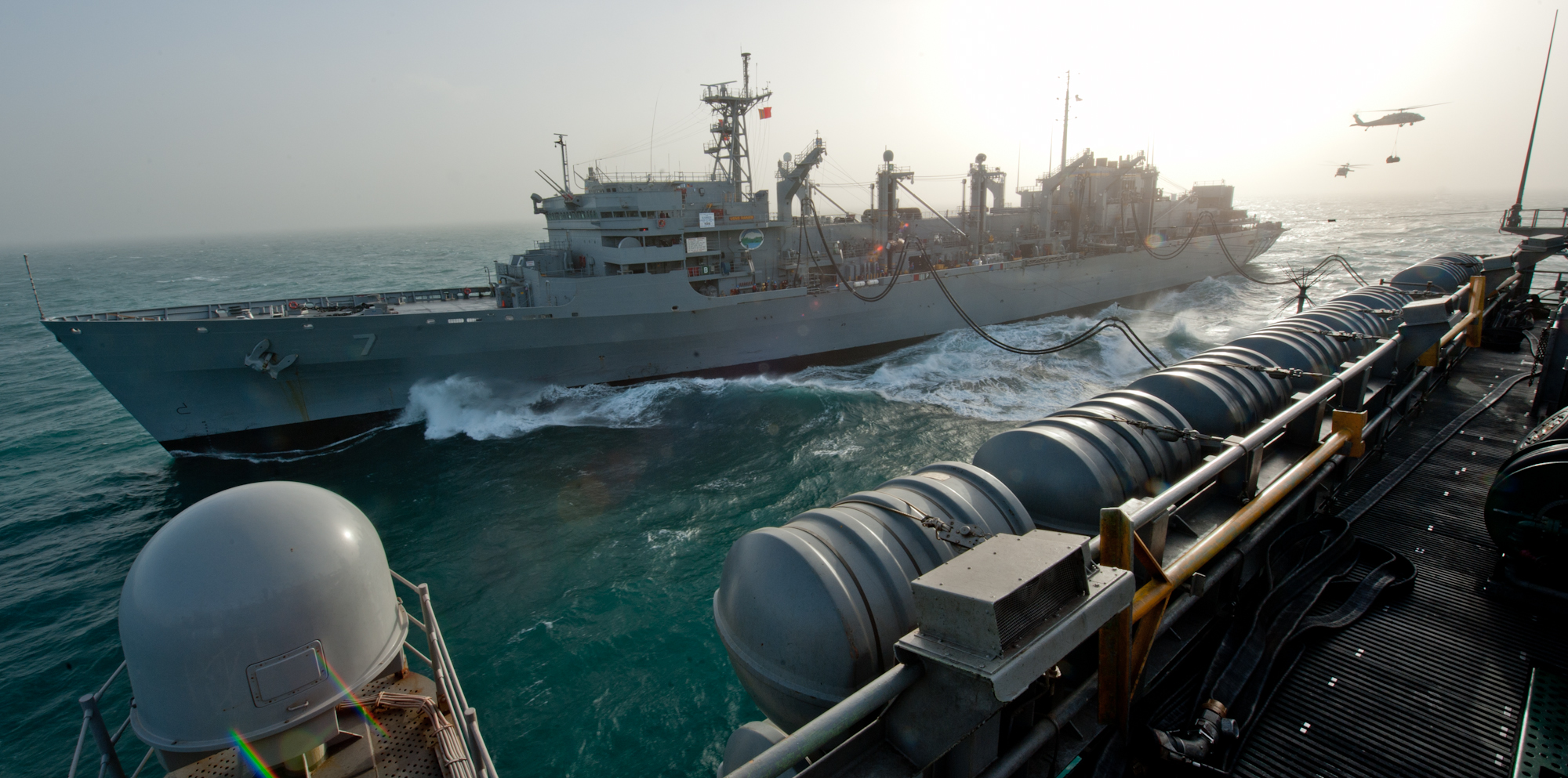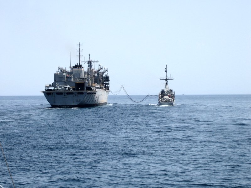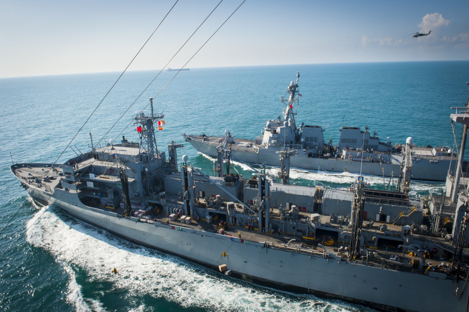 USNS Rainier (T-AOE-7) during a replenishment-at-sea. Bunker Hill is deployed in the U.S. 5th Fleet area of responsibility supporting Operation Inherent