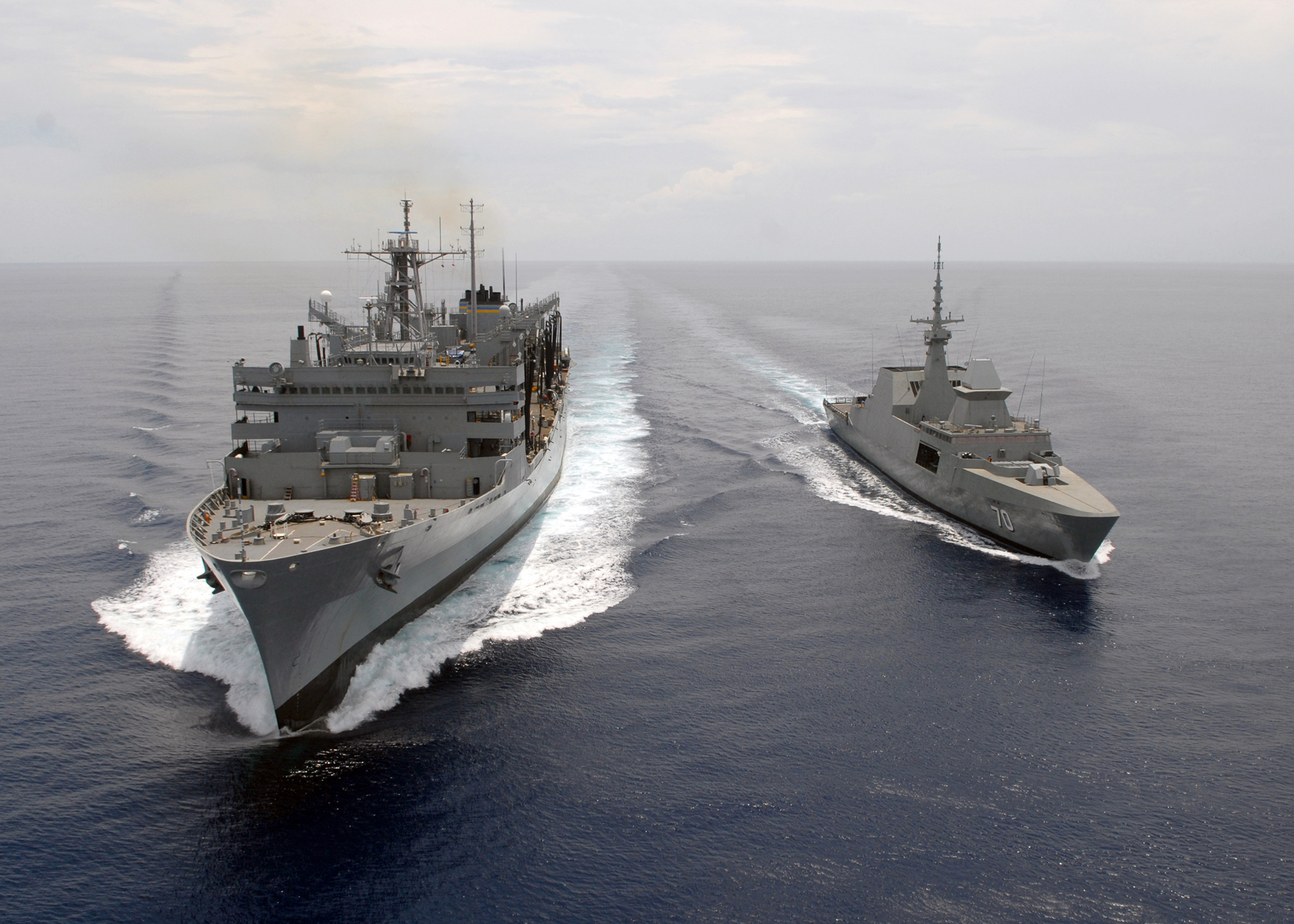 1040k | The Republic of Singapore Navy guided-missile frigate RSS Steadfast (FFG-70) comes alongside USNS Rainier (T-AOE-7) during a simulated refueling at sea, 15 April 2008. Rainier and other ships assigned to Carrier Strike Group 9 are on a scheduled seven-month deployment to the U.S. 5th Fleet area of responsibility. US Navy photo # 080415-N-7981E-582 PACIFIC OCEAN (April 15, 2008) by MC2 James R. Evens |
