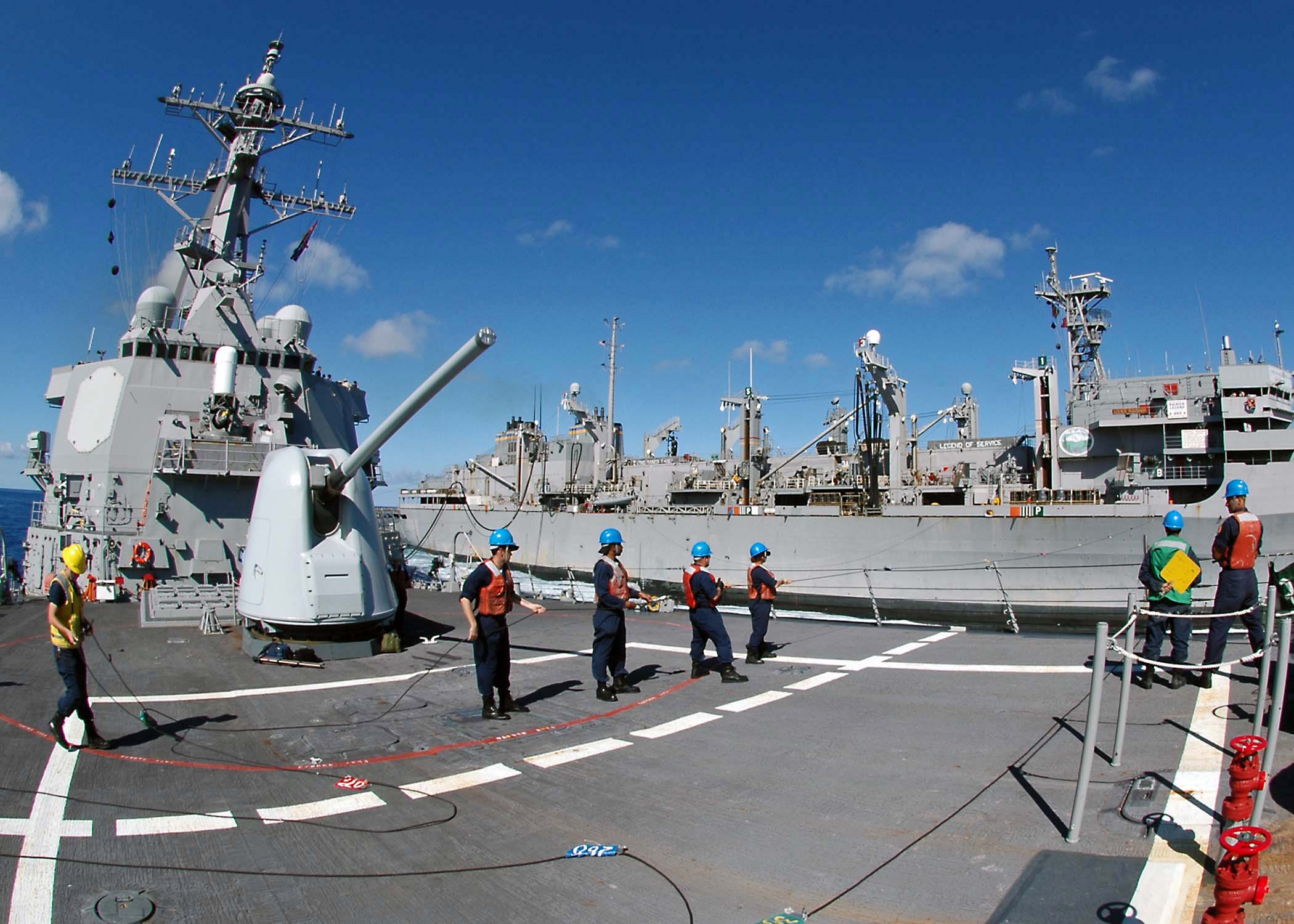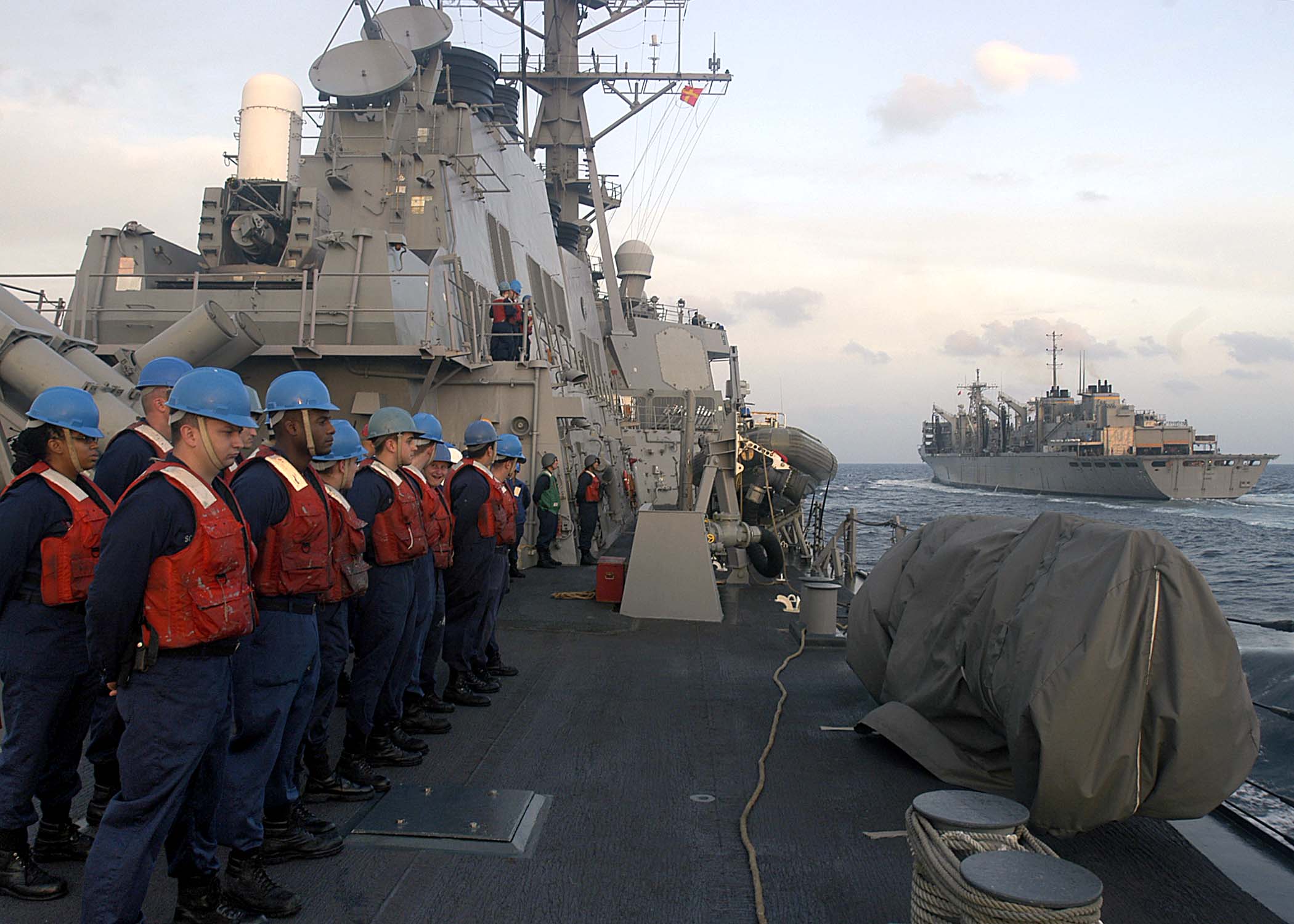 264k | Sailors aboard the guided-missile destroyer USS Benfold (DDG-65), stand-by to conduct an underway replenishment (UNREP) with USNS Rainier (T-AOE-7), 3 January 2005. Benfold is assigned to the USS Abraham Lincoln (CVN 72) Carrier Strike Group, currently operating in the Indian Ocean off the waters of Indonesia and Thailand in support of Operation Unified Assistance. US Navy photo # 050102-N-9079D-317 Indian Ocean (Jan. 2, 2005) by PHAN Ronald Dallatorre. |