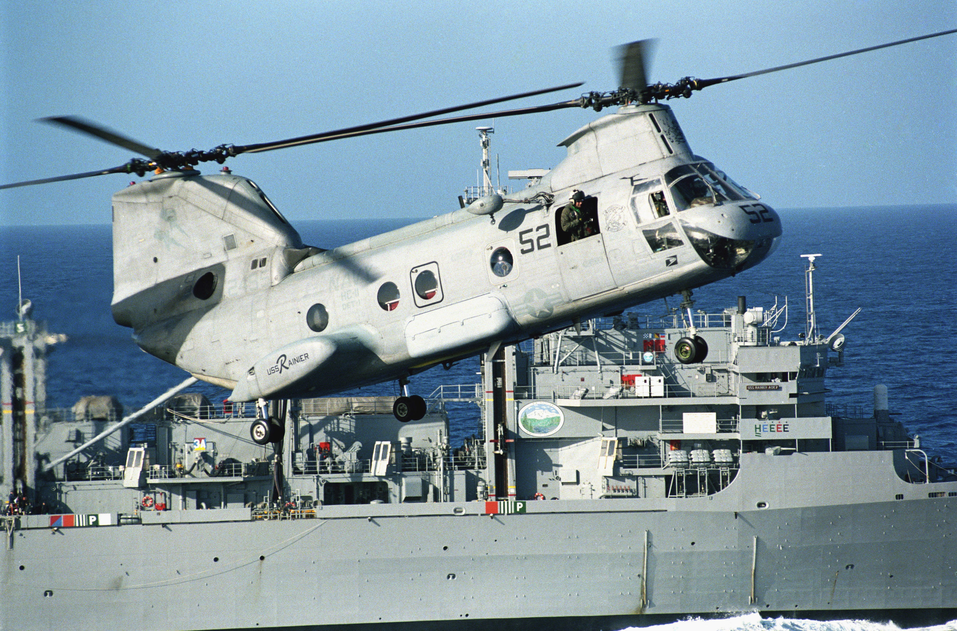 Helicopter Combat Support Squadron One One (HC-11), Detachment One, flies alongside USS Rainier (AOE-7) during vertical replenishment (VERTREP) operations with the aircraft carrier USS Constellation (CV-64). Rainier and HC-11 currently support the Constellation Battle Group as it sails towards the Arabian Gulf on a regularly scheduled deployment. US Navy photo #'s 010412-N-0295M-002 and 010412-N-0295M-001by PHAN Daniel J. McLain. |