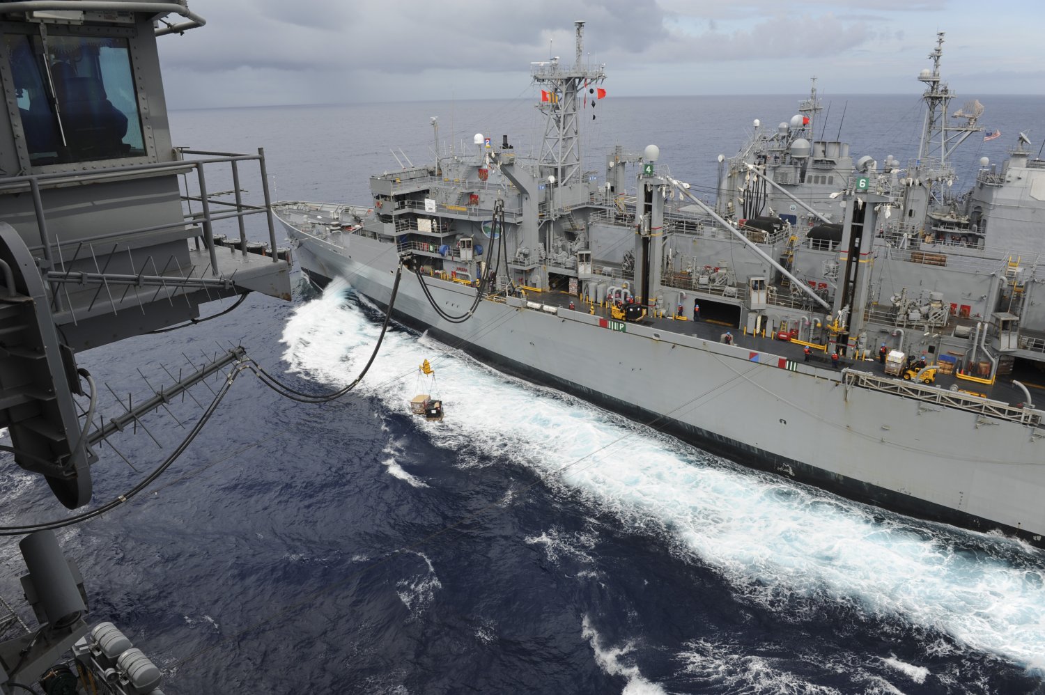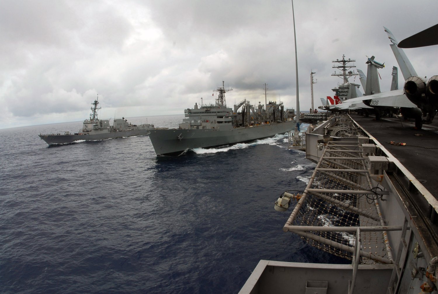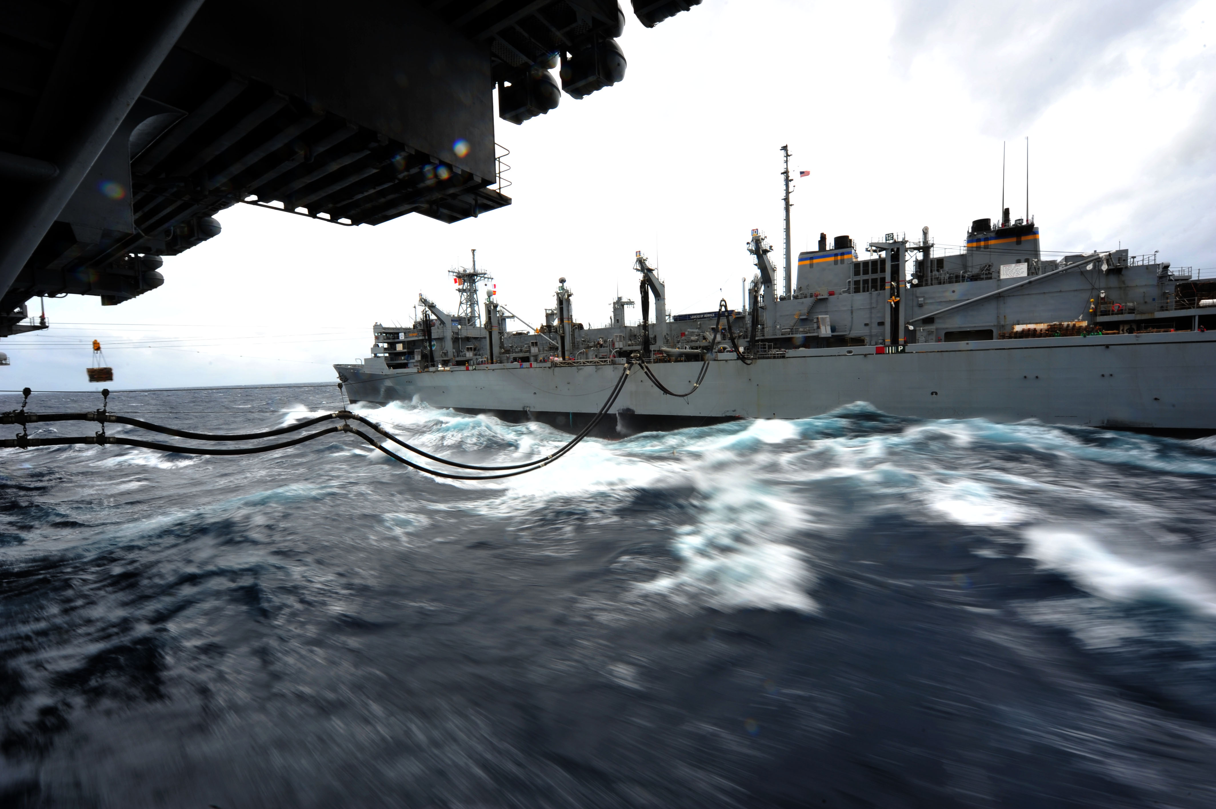 USS Ronald Reagan (CVN-76) from USNS Rainier (T-AOE-7) during a replenishment at sea, Gulf of Oman, 20 August 2009. Ronald Reagan