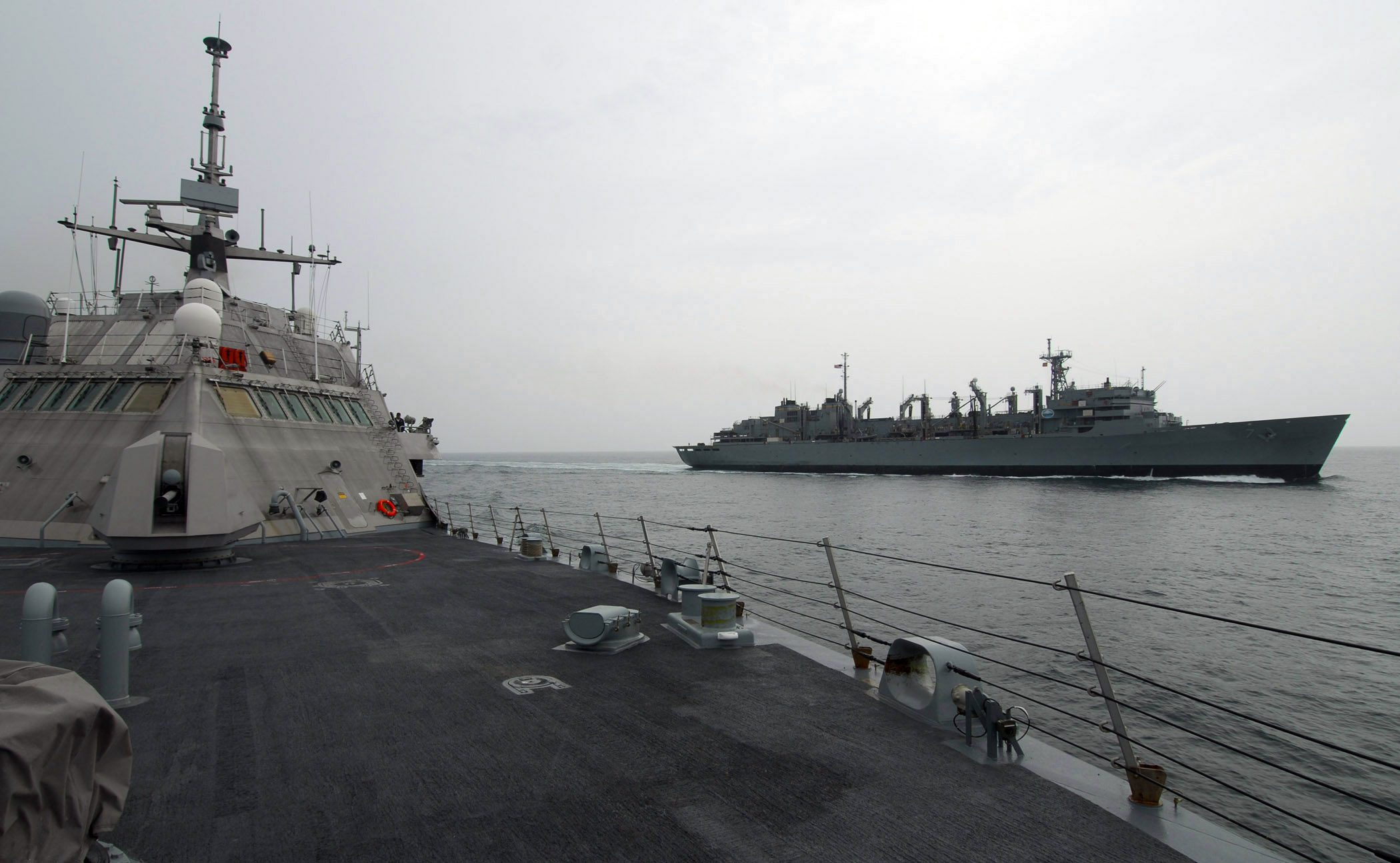 368k | The littoral Combat ship USS Freedom (LCS-1) breaks away from USNS Rainier (T-AOE-7) after a refueling at sea. Freedom is conducting counter-illicit trafficking operations in the US 4th Fleet area of responsibility. US Navy photo # 100331-N-7058E-294 PACIFIC OCEAN (March 31, 2010) by LT. Ed Early. |