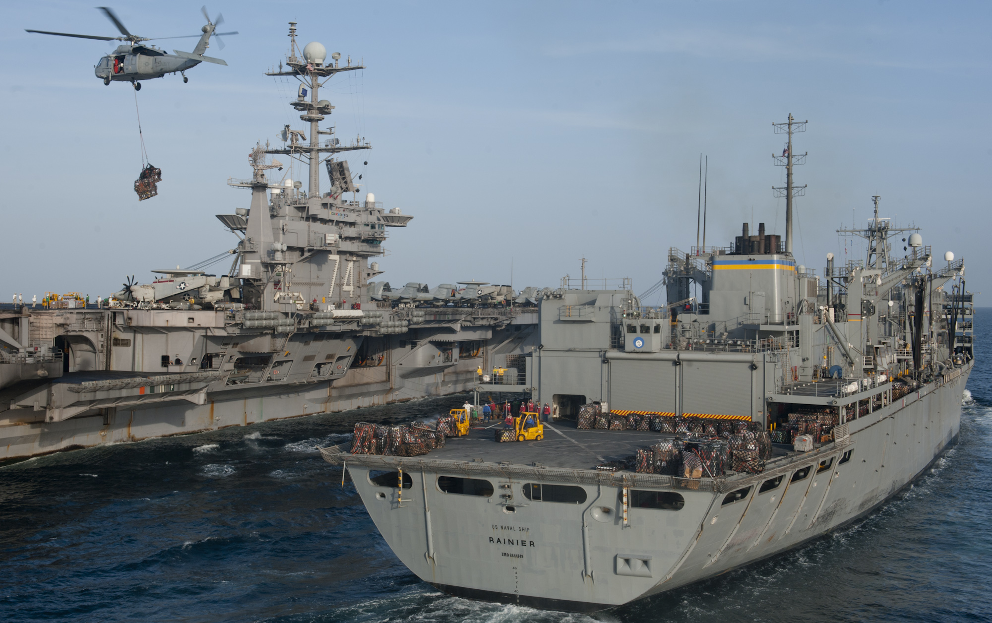 873k | USNS Rainier (T-AOE-7) conducts a vertical replenishment (VERTREP) with the Nimitz-class aircraft carrier