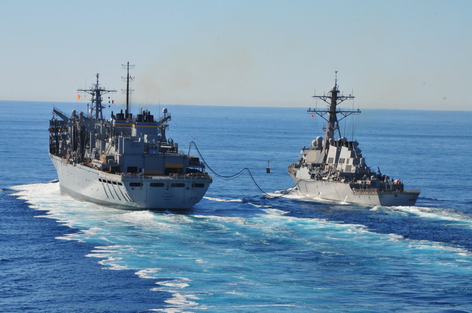 USNS Rainier (T-AOE-7) finishes a breakaway after completing a replenishment-at-sea with the guided-missile destroyer