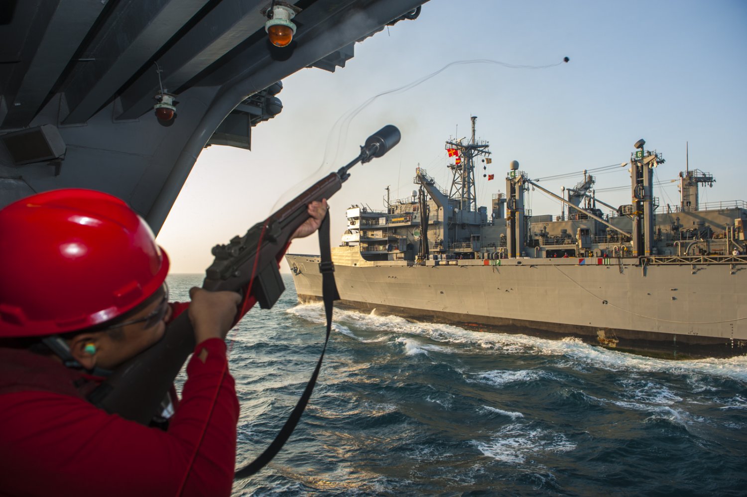 Aviation Ordnanceman Airman Jon Reolizo fires a shot line from an M14 aboard the Nimitz-class aircraft carrier USS Carl Vinson (CVN-70) during a replenishment-at-sea with USNS Rainier (T-AOE-7). Carl Vinson is deployed to the area supporting maritime security operations, strike operations in Iraq and Syria as directed, and theater security cooperation efforts in the 5th Fleet Area of responsibility. |