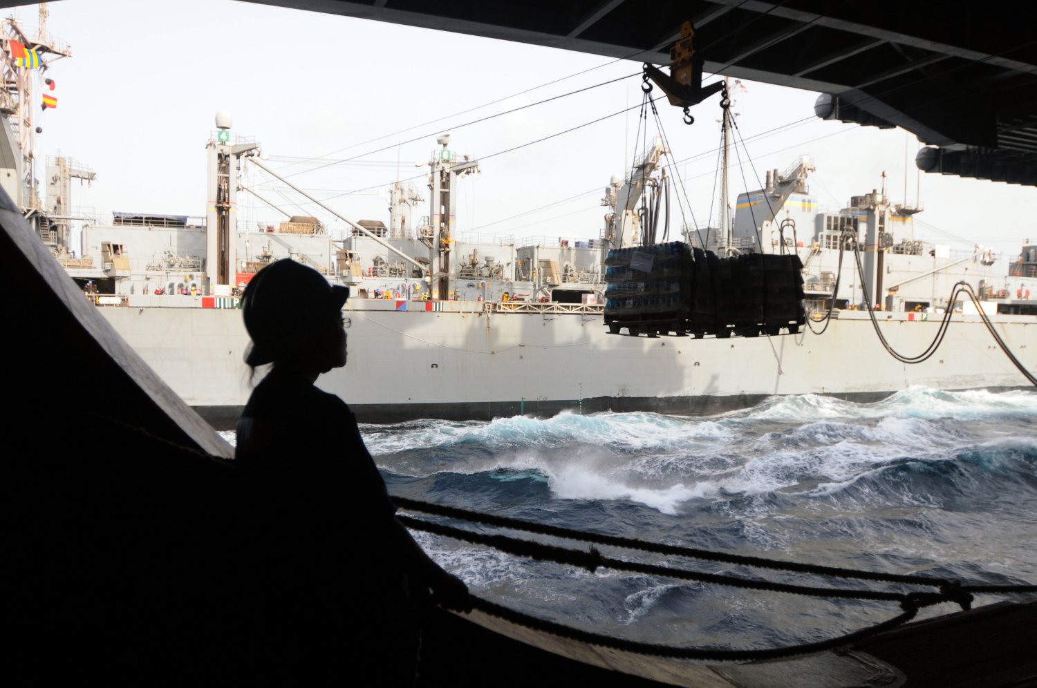 210k | Seaman Jennifer Nong holds the lifeline steady as pallets come across a tension line into the hangar bay of the aircraft carrier