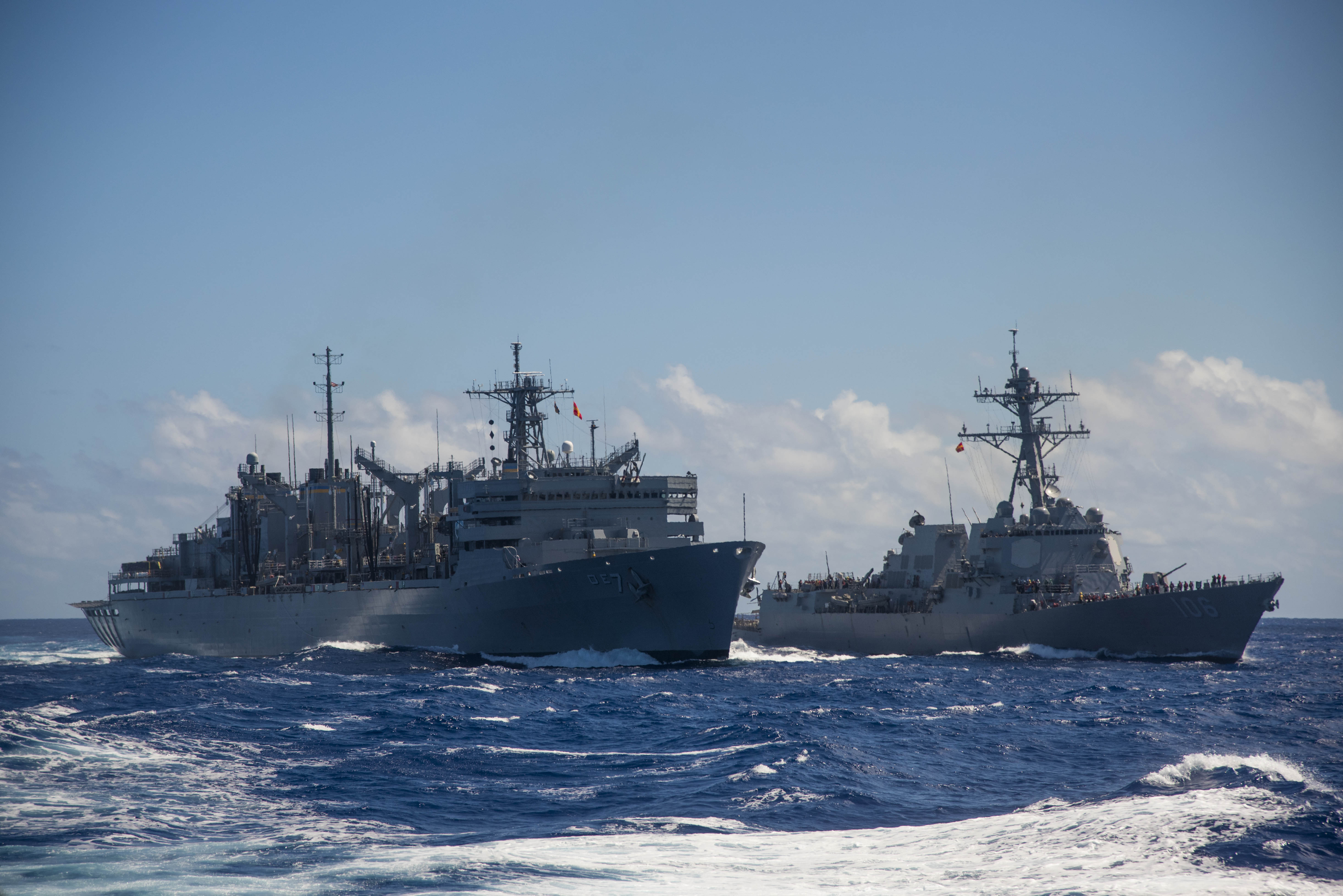 USNS Rainier (T-AOE-7) conducts a replenishment-at-sea with the Arleigh Burke-class guided-missile destroyer USS Sterett (DDG-104). Sterett is deployed in the U.S. 5th Fleet area of operations supporting Operation Inherent Resolve, strike operations in Iraq and Syria as directed, maritime security operations, and theater security cooperation efforts in the region. |