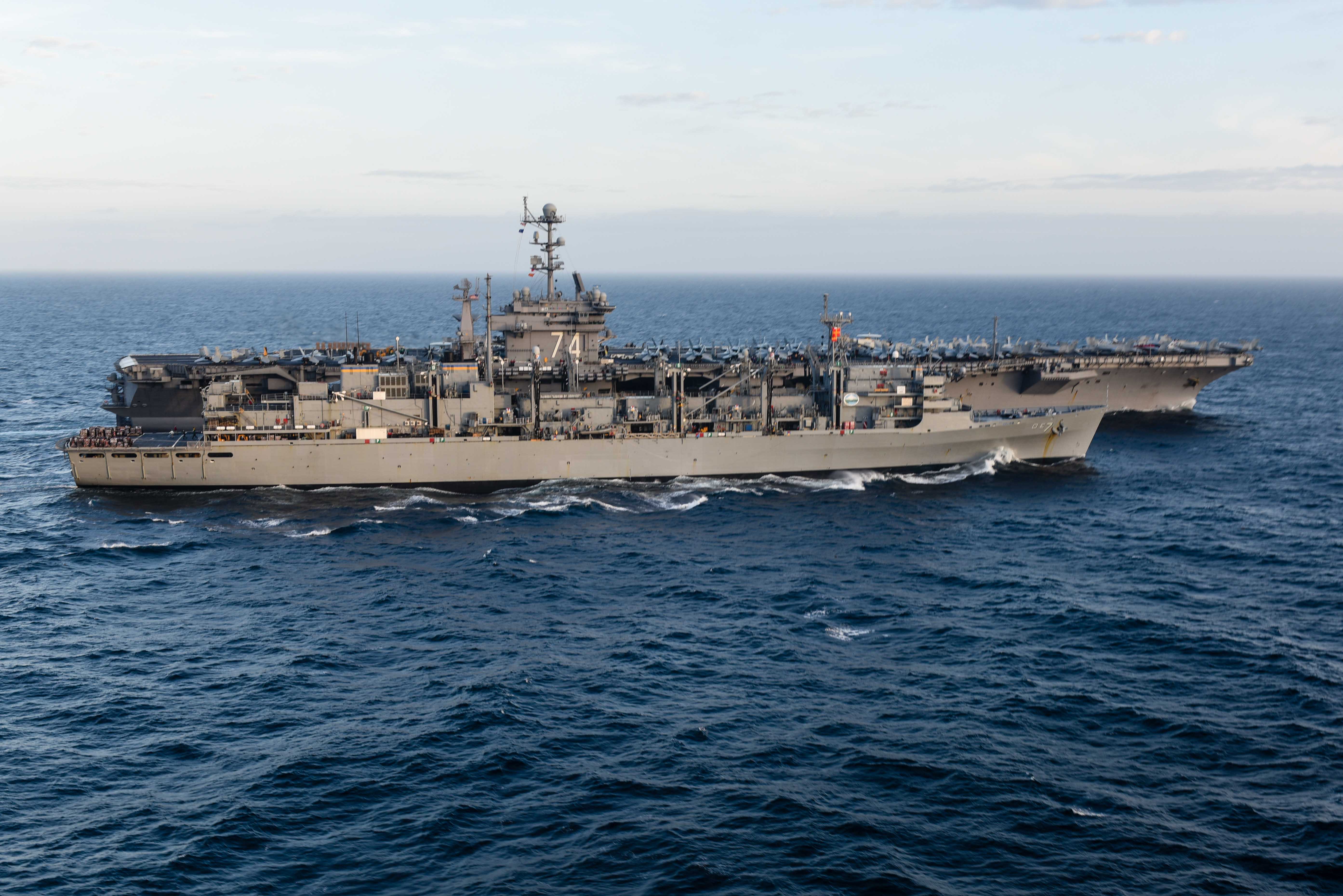 USNS Rainier (T-AOE-7) during a replenishment-at-sea. Providing a ready force supporting security and stability in the Indo-Asia-Pacific, Stennis