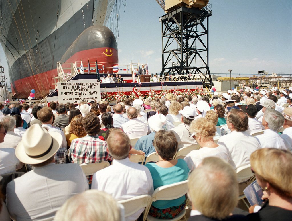 192k | Rainier (AOE-7) launching, 28 September 1991, at National Steel and Shipbuilding, Co., San Diego, CA.