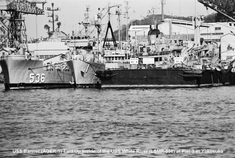 95k | USS White River (LSMR-536) and USS Banner (AGER-1) moored at Pier 3 Naval Station Yokosuka, Japan, date unknown. Note USS Kearsarge (CV-33) in the background. | Richard Miller BMCS USNR Ret. | |