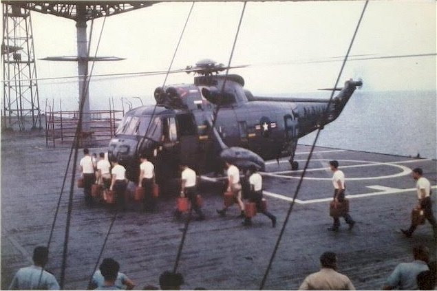 58k | USS Annapolis (AGMR-1) crew men load a SH-3A Sea King helicopter belonging to HCS-2 (HS-2 "Golden Falcons") from USS Hornet (CVS-12) with firefighting foam to be delivered to USS Forestal CV-59, during the tragic flight deck fire that the carrier suffered in July 1967. | Photo by David Eastman ETN3 USS Annapolis, contributed by his brother Philip Eastman USS Monmouth County | |