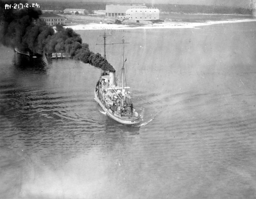 96k | USS Allegheny (AT-19) approaching Naval Air Station (NAS) Pensacola in 1924 with a TS aircraft aboard. US Navy and Marine Corps Museum/Naval Aviation Museum, Photo No. 1989.119.001.026 |