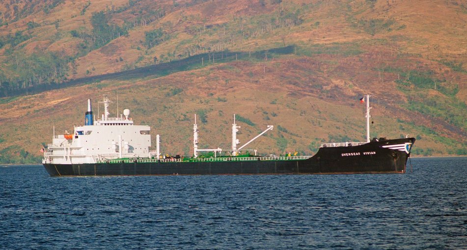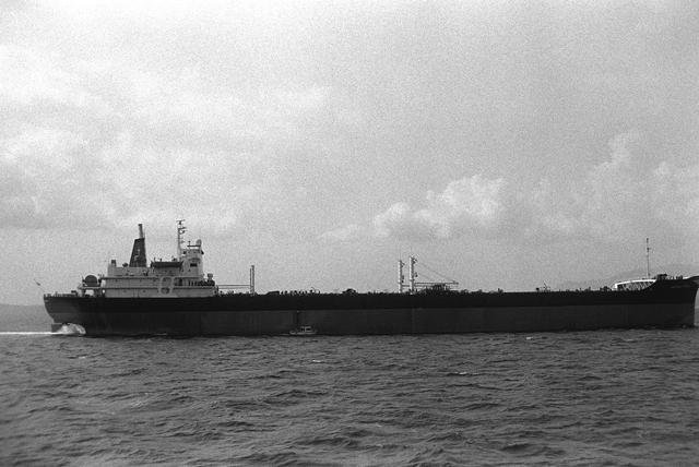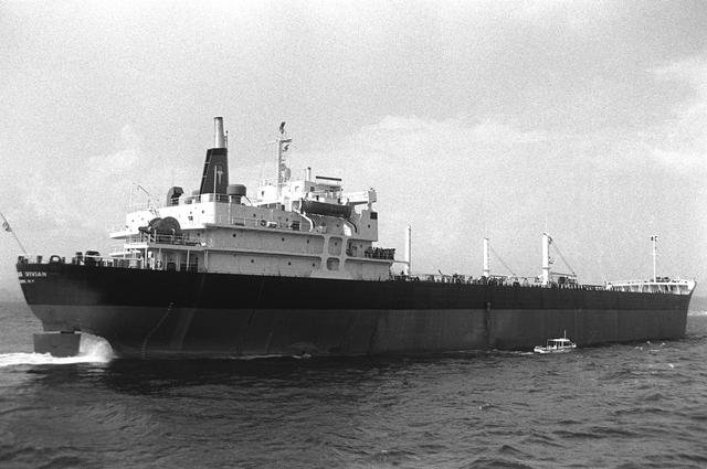 ST Overseas Vivian (AOT-1205) entering Subic Bay, P.I. The commercial tanker, which was operating under a charter with MSC, transported 109 Vietnamese refugees to the Naval Base at Subic Bay, following their recovery from a disabled boat in the South China Sea on 29 April 1989. US DOD photo # DNSN8909071, photo by PH1 Michael D. Flynn. |