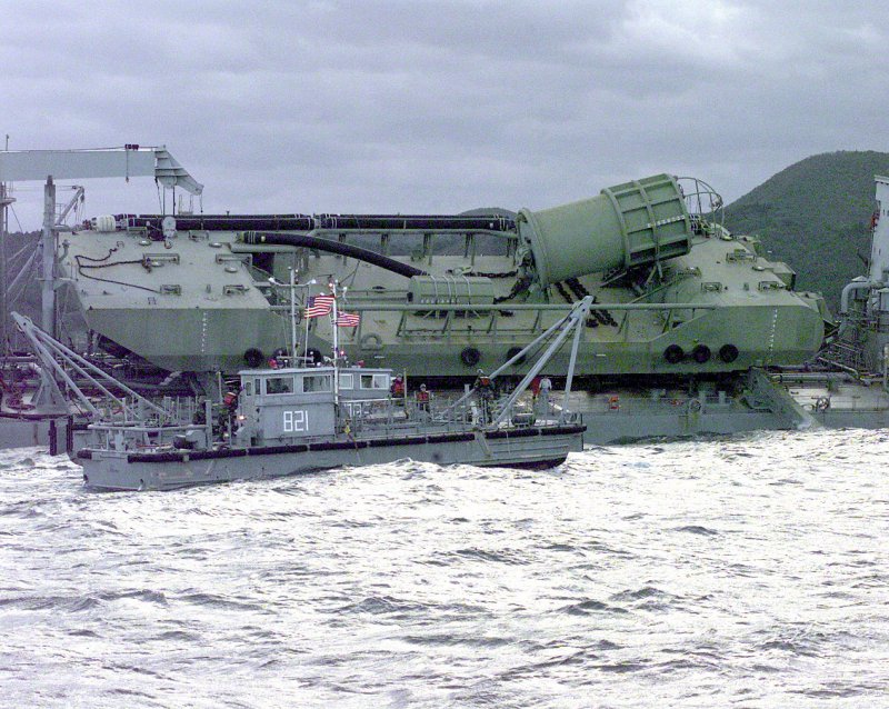 144k | A Utility boat passes ST Petersburg (AOT-9101) in Pohang Harbor, Republic of Korea, 20 October 1998, as she prepares to deploy a single-anchor leg mooring system (SALM). Once deployed, the SALM provides a semipermanent platform for continued fuel discharge operations. US Navy photo # 981020-F-5789F-503 by SSGT Steve Faulisi, from the collections of the Defense Information Visual Center. |