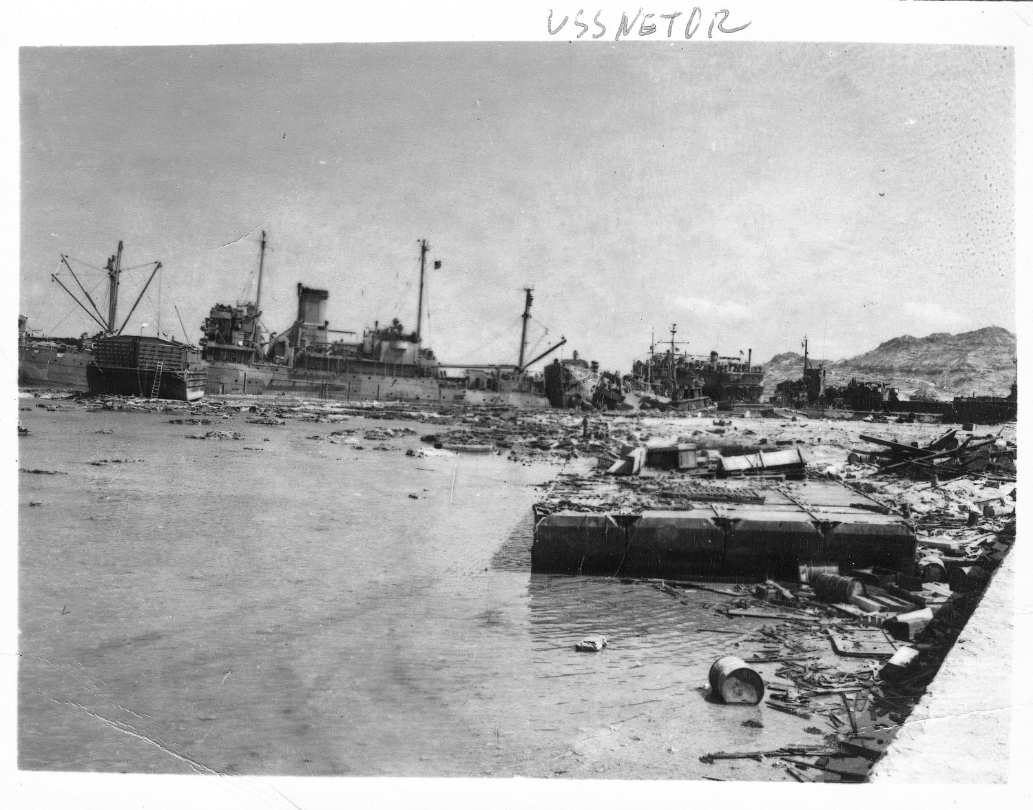338k | USS APL-14 and wrecks of USS Nestor (ARB-6) and unknown tug at Buckner Bay, Okinawa, in October 1945. US Navy photo |