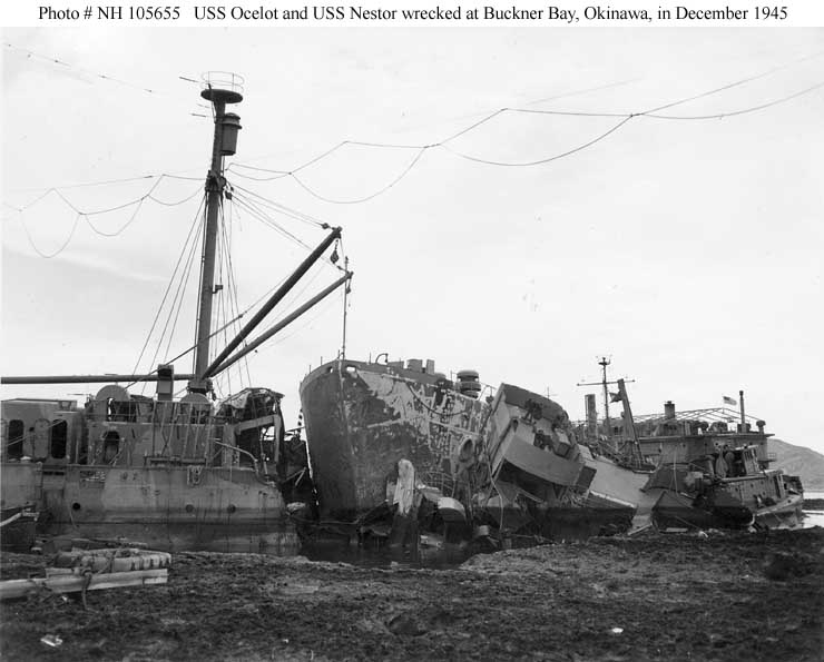 78k | USS APL-14 is visible beyond USS Ocelot (IX-110) aground in Buckner Bay, Okinawa, with her stern severed by USS Nestor (ARB-6), after Typhoon Louise ravaged that port in October 1945. Nestor's bow is in the center of this photo.