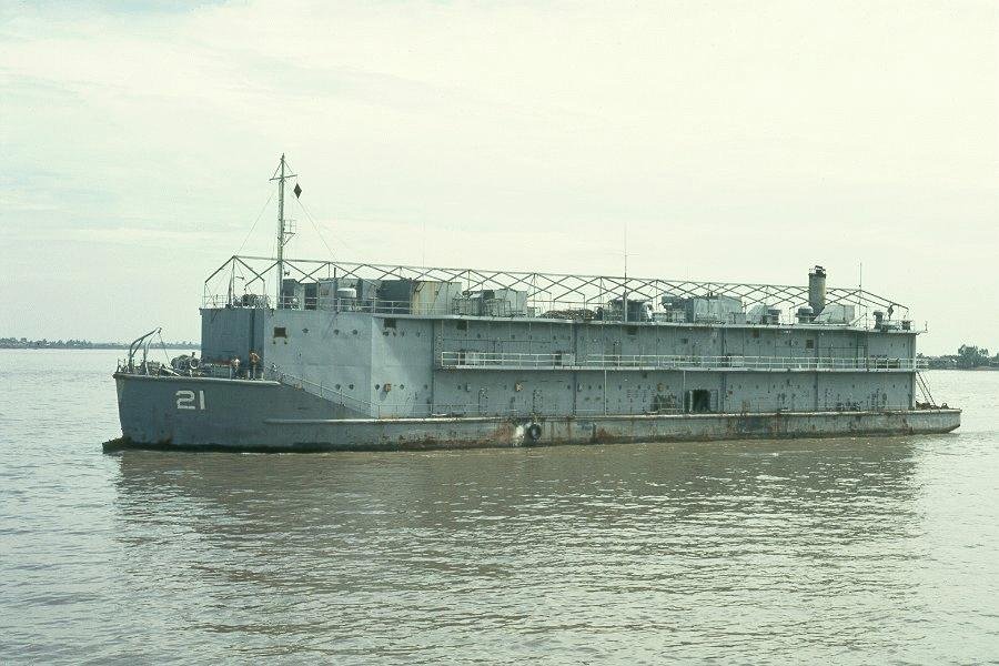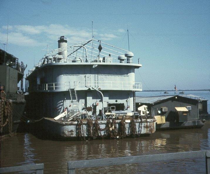 119k | APL-21, at Nha Be, Republic of Vietnam, 1972, Note fixed rudder welded to bow. | © Richard Leonhardt | |