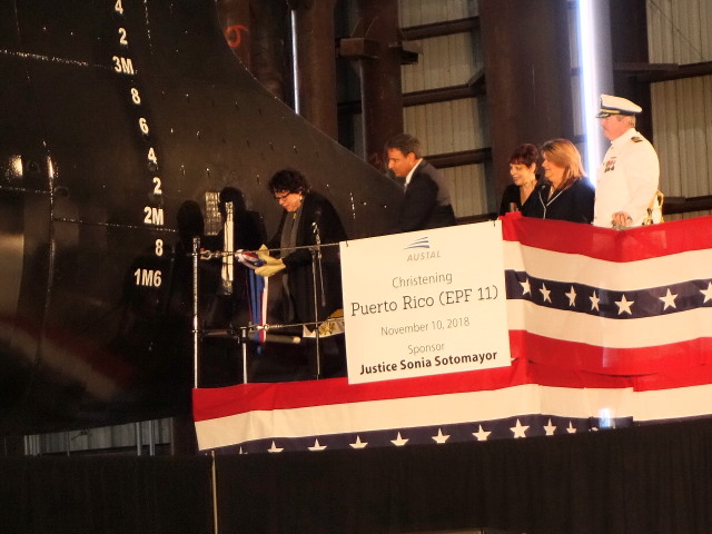 Christening, 10 November 2018, of Puerto Rico (T-EPF-11) by U.S. Supreme Court Justice Sonia Sotomayor at Austal USA Shipyard Mobile, AL. |