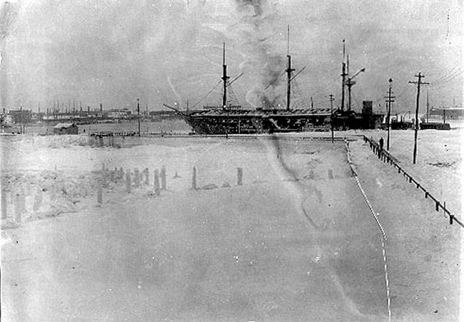 67k | Winter view of USS Wabash at Boston Navy Yard, while serving as receiving ship, circa 1898-1899.
