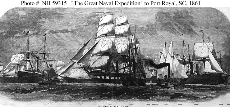 1861 volume, pages 696-697, depicts Federal warships and transports, under Flag Officer Samuel F. DuPont, USN, departing Hampton Roads, Virginia, en route to Port