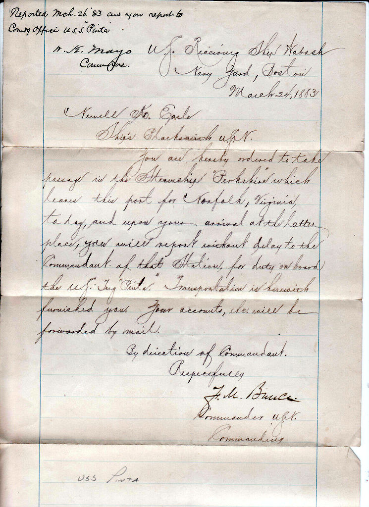 194k | Orders for Ship's Blacksmith Newell K. Earle USN to report to USS Pinta for duty at Norfolk, VA., signed by Commanding Office, Receiving Ship USS Wabash, 24 March 1883, Boston Navy Yard. | Tommy Trampp | |