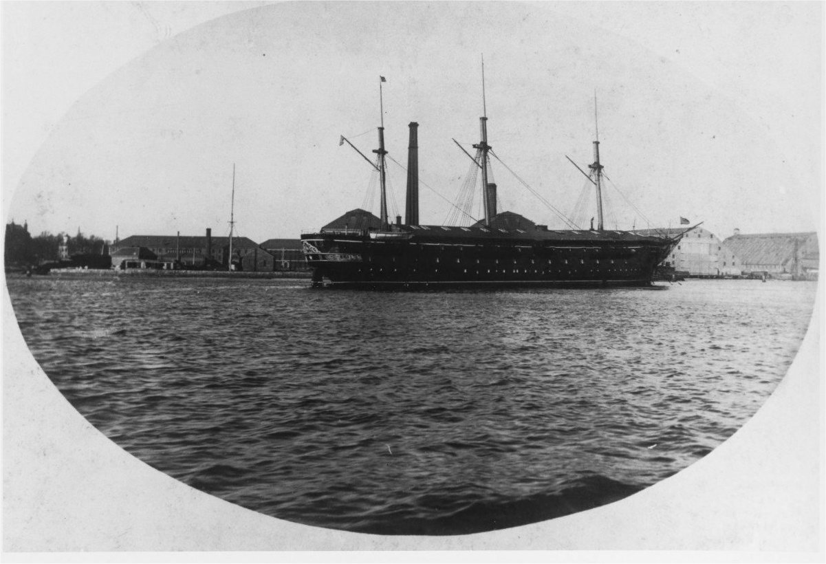50k | USS Wabash while serving as receiving ship at the Boston Navy Yard, MA., sometime after 1876. Note that she has been partially housed over, but retains her masts and spars.
