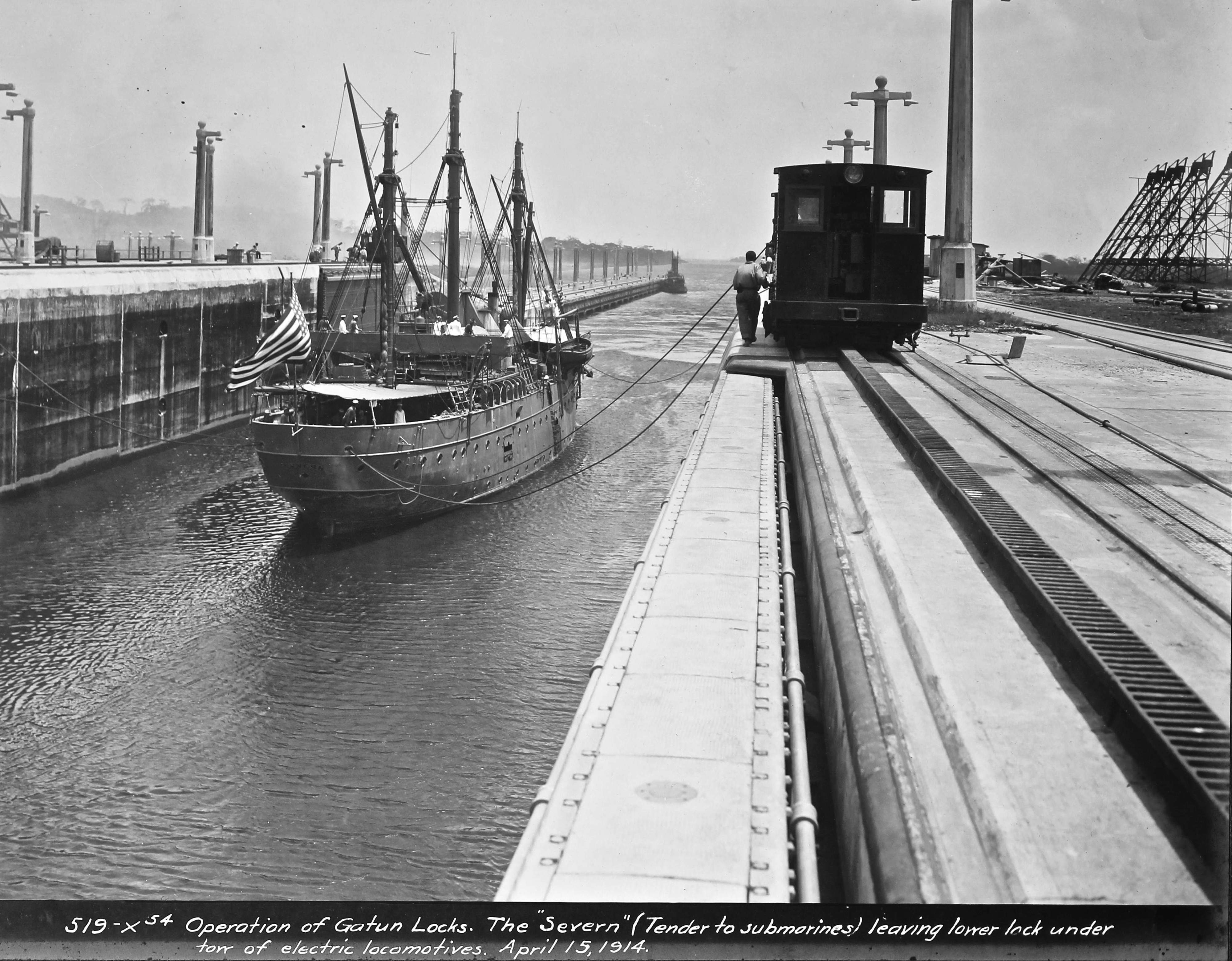 1.10k | USS Severn leaving Gatun Locks, lower lock, Panama Canal, 15 April 1914, under tow of the electric locomotives. | Photo by Ernest Hallen, from the digital collection of Ron Armstrong, author of The Panama Canal, the Invisible Wonder of the World | |