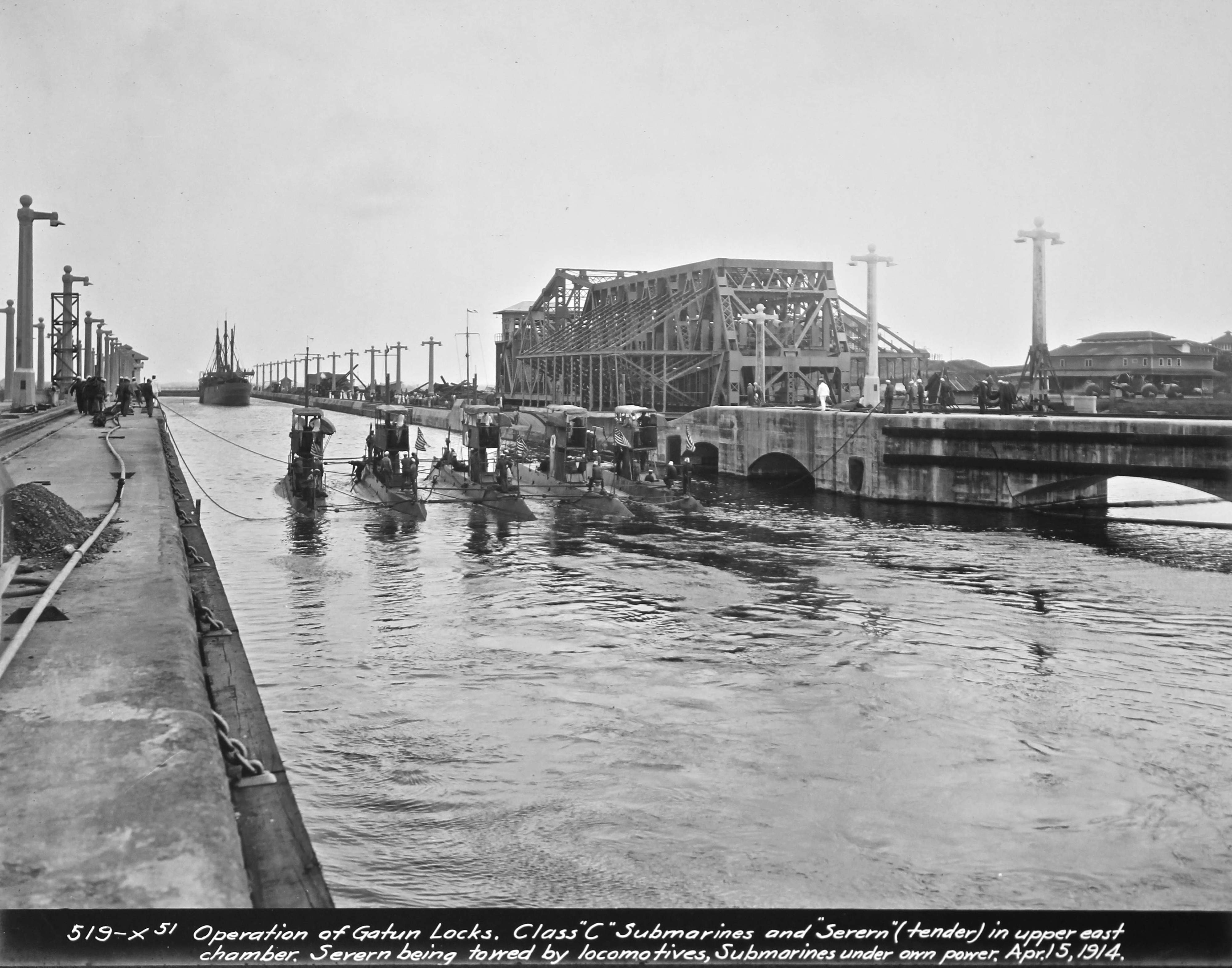 884k | USS Severn being towed by electric locomotives in the upper east chamber of Gatun Locks, 15 April 1914. All five of the Navy's Class "C" submarines: USS Octopus (SS-9), USS Stingray (SS-13), USS Tarpon (SS-14), USS Bonita (SS-15) and USS Snapper (SS-16) following (Severn) are under their own power. | Photo by Ernest Hallen, from the digital collection of Ron Armstrong, author of The Panama Canal, the Invisible Wonder of the World | |