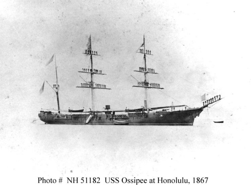 72k | USS Ossipee at anchor in 1867 off Honolulu, T.H. with her crew manning the yards. This photograph has also been captioned as showing USS Lackawanna, but is actually Ossipee in her 1862-1872 configuration. US Naval History and Heritage Command photo # NH 51182, Courtesy of the Naval Historical Foundation; Collection of W. Beverley Mason Jr., 1962. |