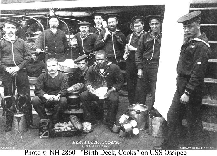 center, leaning on the grating rack. Note Marine sentry at the gangway, hammock stowage, and large percentage of black sailors among the crew at left.