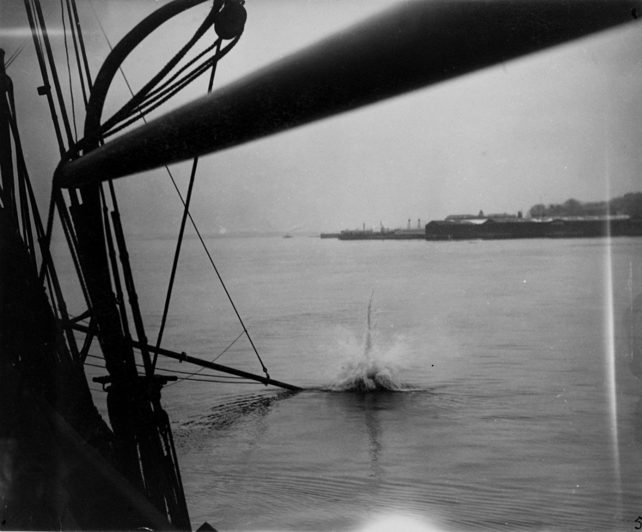 178k | USS Ossipee practicing with a spar torpedo rigged abeam, February 1887.