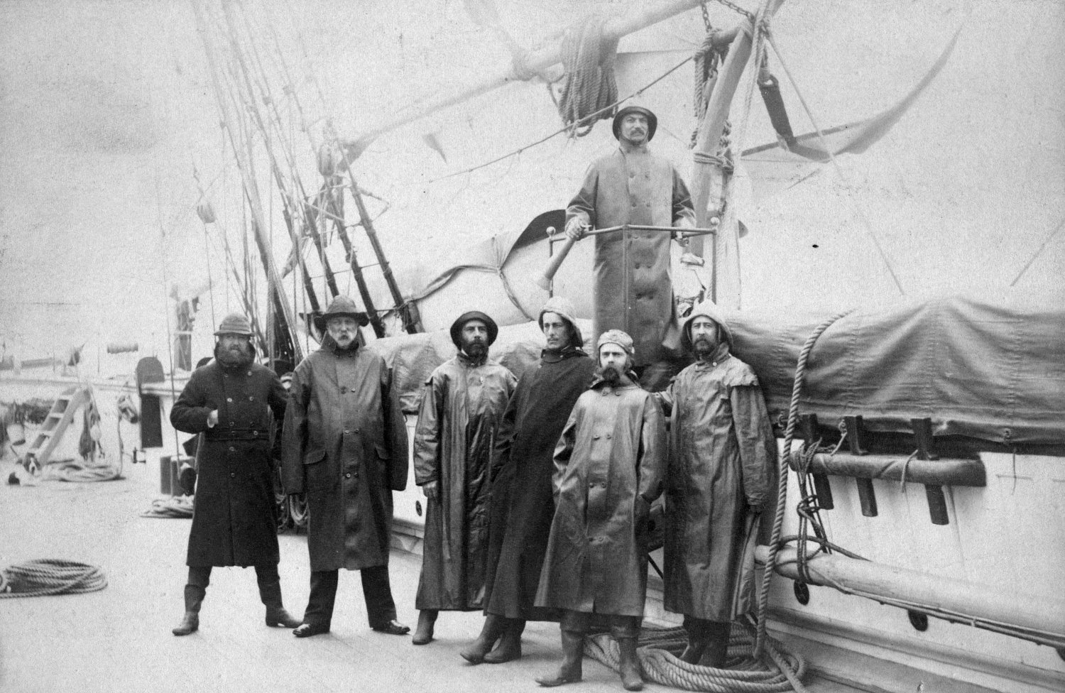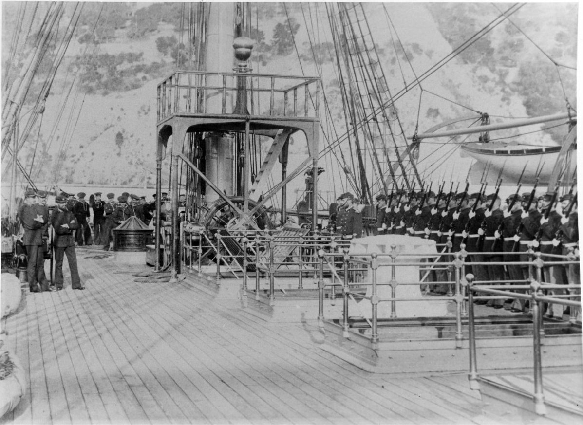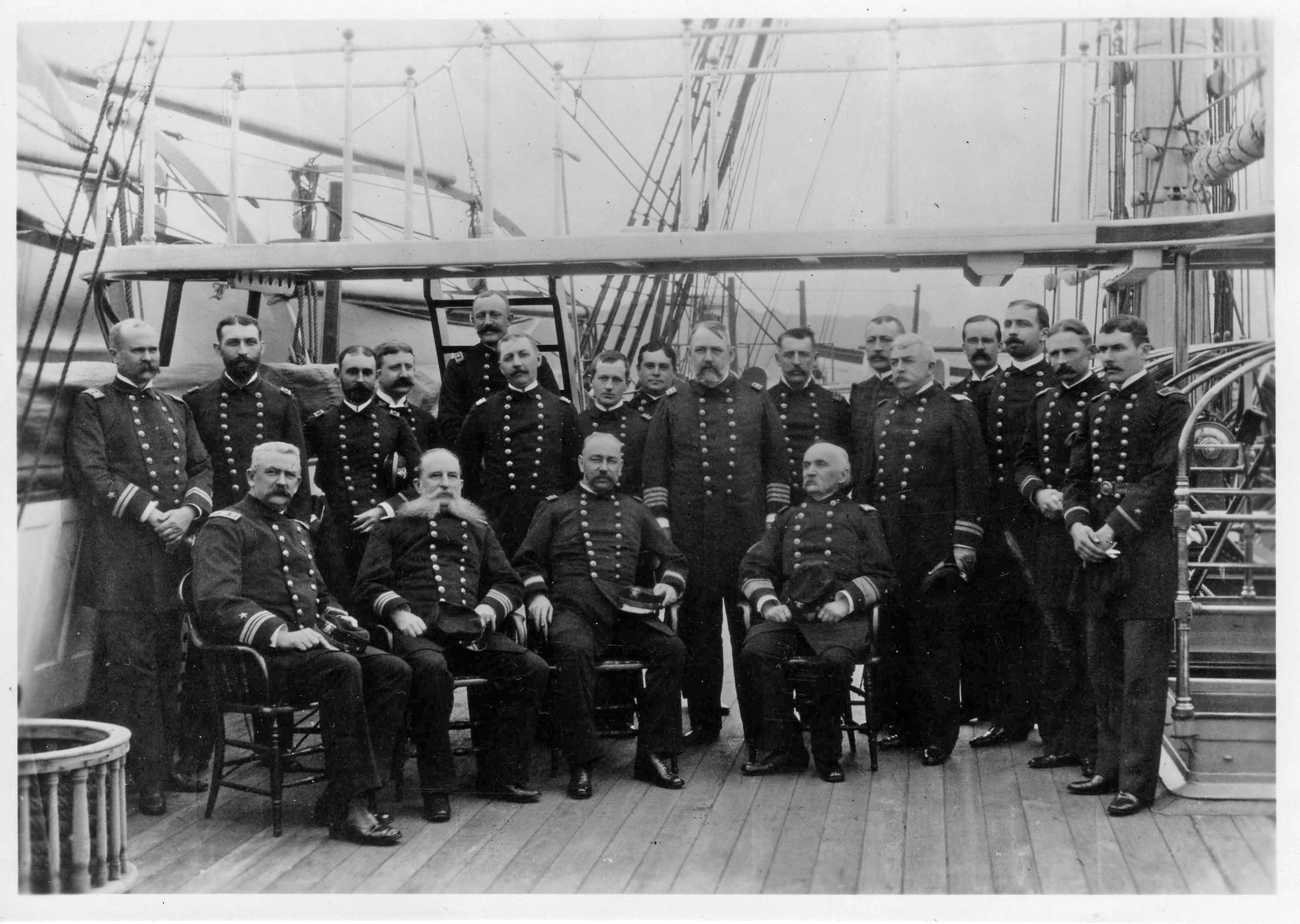 Commanding European Station; Lieutenant Commander George A. Converse; Lieutenant Allen G. Paul, Flag Lieutenant. On board USS Lancaster at Southampton in 1883.