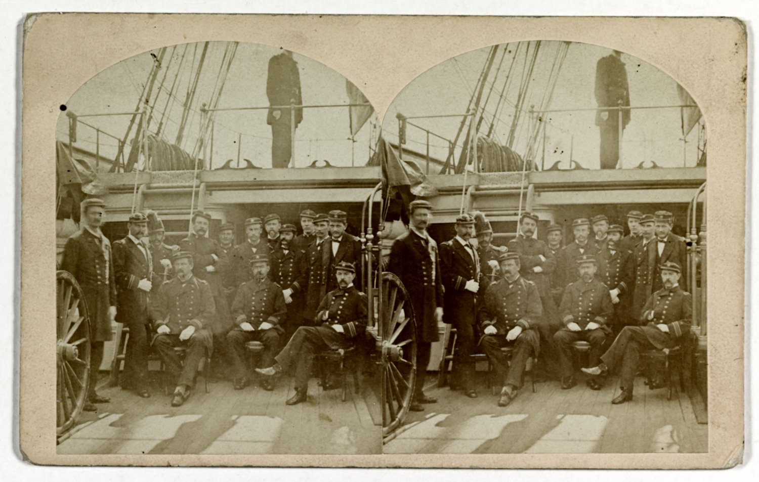 239k | Sterographic photo of USS Lancaster officers 1883. CDR. George C. Remey in center. US Naval History and Heritage Command photo# NH 378. Courtesy of Rear Admiral George C. Remey collection. |