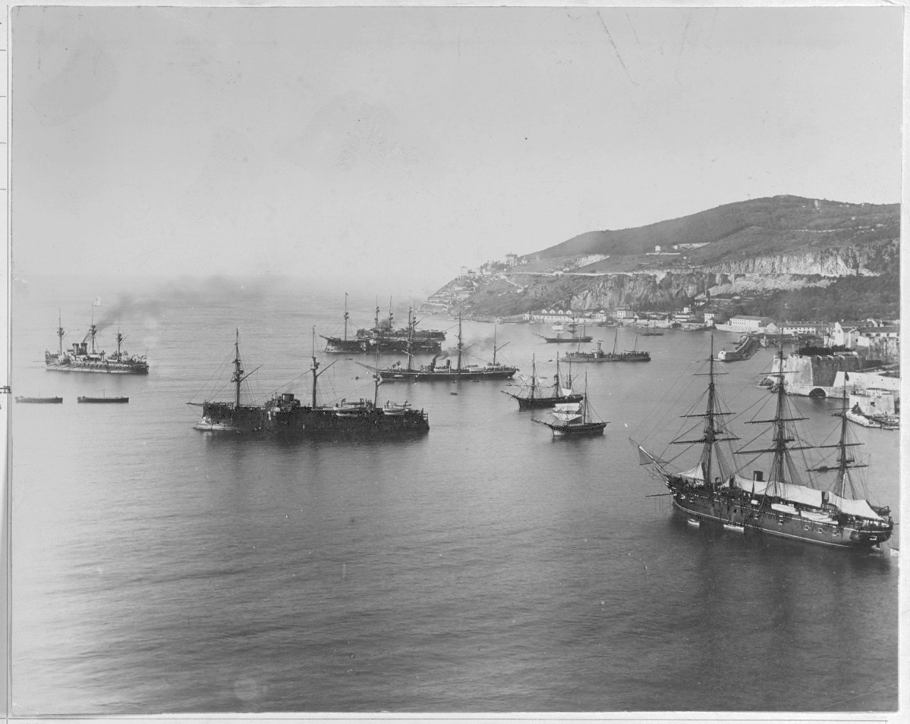 183k | USS Lancaster at Villefranche, France in 1889. Other ships include: Admiral Duperre (French), Colbert
