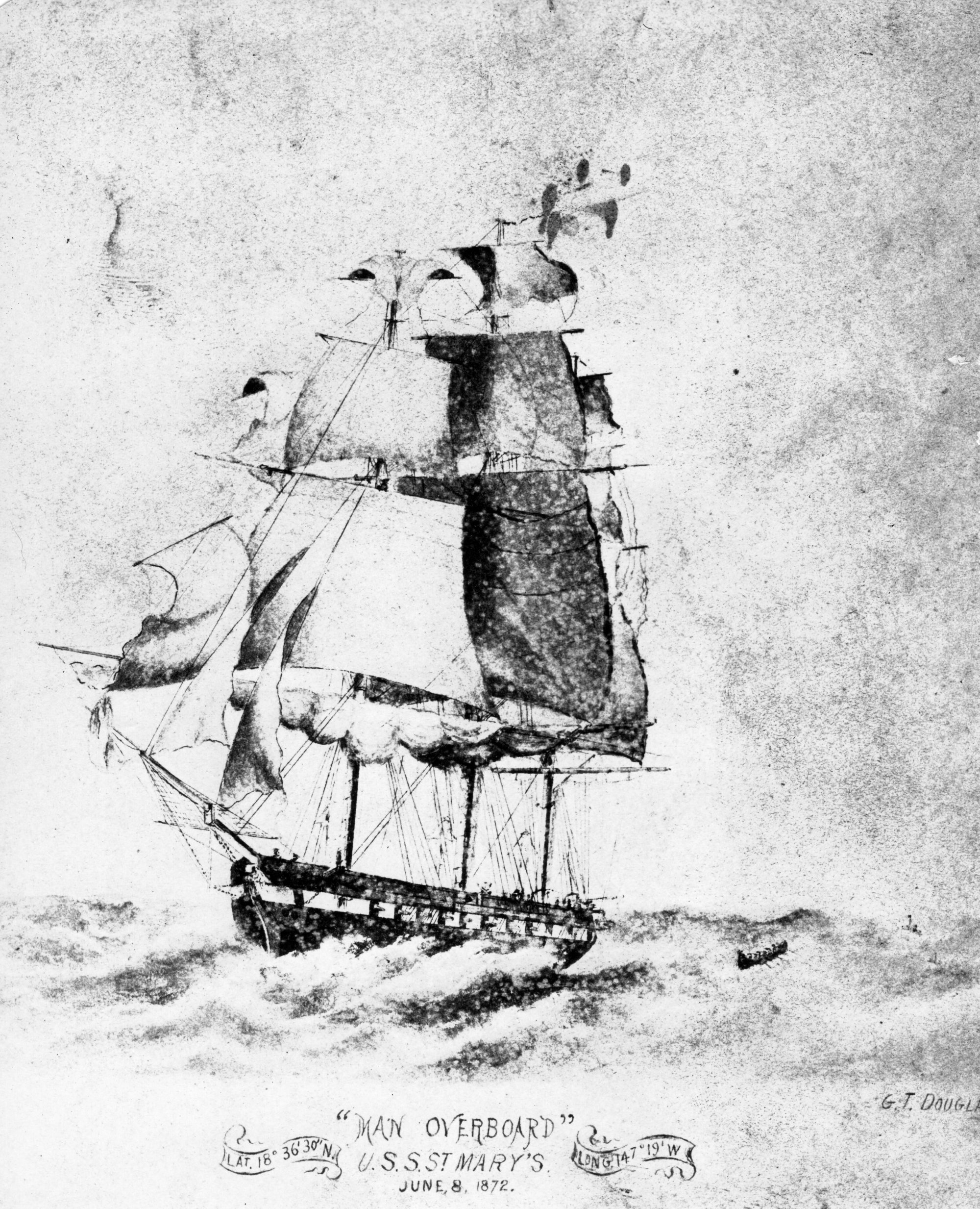 1108k | Sketch of USS St. Mary's at sea titled "Man overboard", 8 June1872, Lat 18° 36' 30"N Long 147° 19'W | Darryl Baker | |