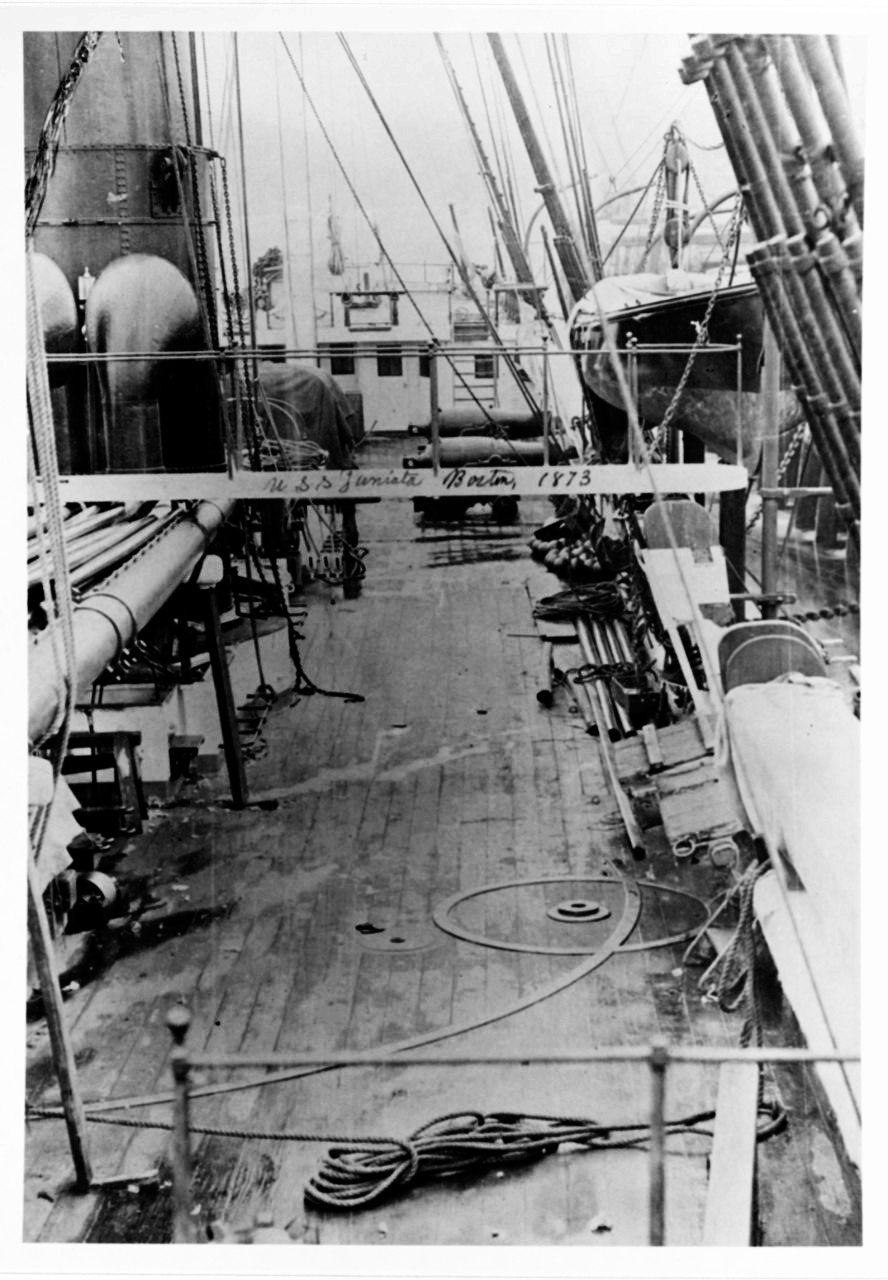 190k | USS Juniata, deck view, looking aft from forecastle at Boston Navy Yard in 1873. Note raceways for 9" Dahlgren pivot gun,