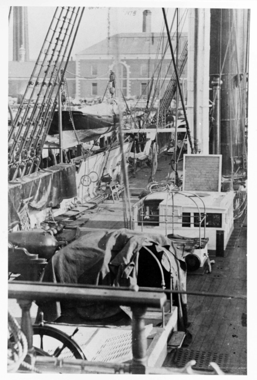 185k | USS Juniata, deck view, looking forward from quarterdeck at Boston Navy Yard in 1873. Note 9" Dahlgren gun at left with shot.