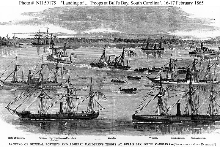 Everding, published in "Harper's Weekly", March 1865, depicting the landings made on 16-17 February 1865. Ships shown include (as identified below the print, from