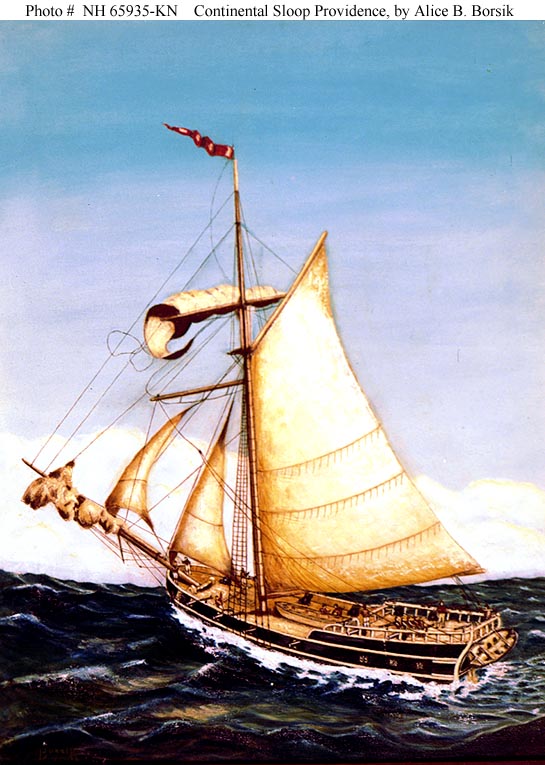 94k | Oil painting by Alice B. Borsik of Continental Sloop USS Providence US Navy History and Heritage Command photo # NH 65935-KN, courtesy of the US Navy Art Collection, Washington, D.C. Donation of Mrs. Alice B. Borsik, 1968 |