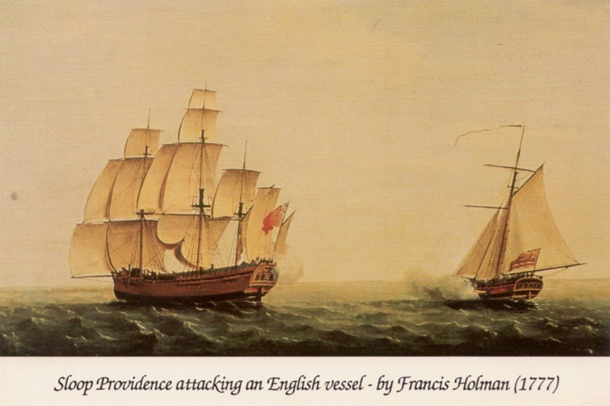 135k | Oil painting by W. Nowland Van Powell of Continental Sloop USS Providence US Navy History and Heritage Command photo # NH 85201-KN , courtesy of the US Navy Art Collection, Washington, D.C. Donation of the Memphis Council, U.S. Navy League, 1976 |